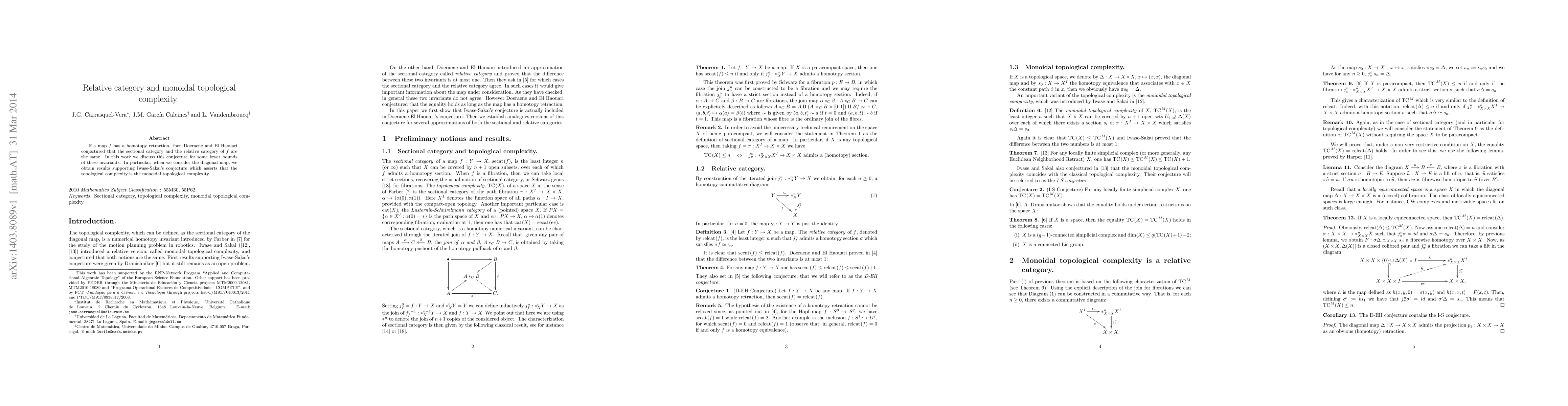 Researchers investigated whether a map's homotopy retraction implies equality between its sectional category and relative category, with results supporting Iwase-Sakai's conjecture that topological complexity is monoidal topological complexity.