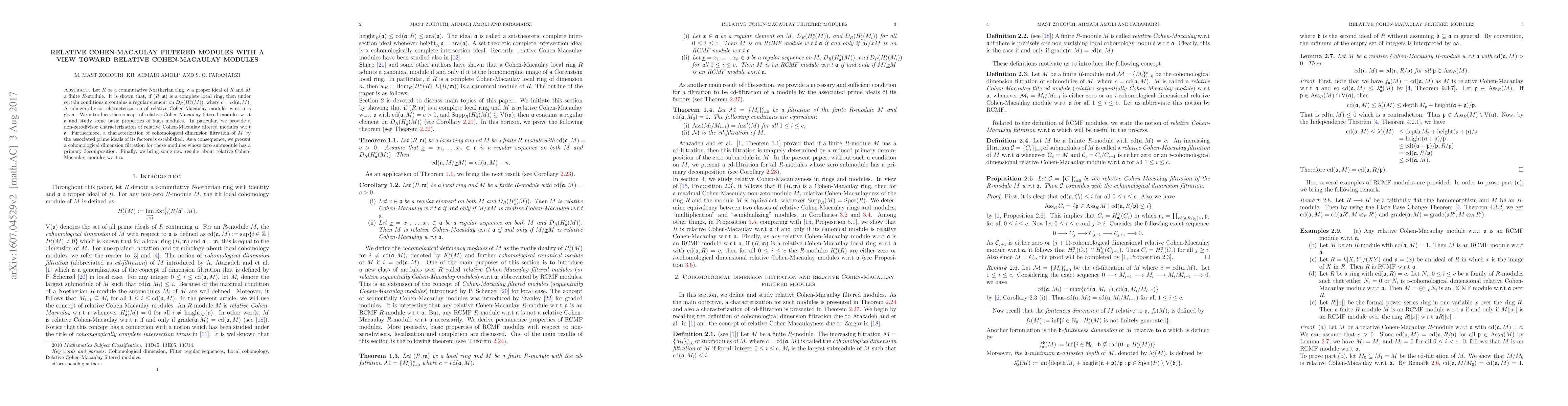 This paper investigates relative Cohen-Macaulay filtered modules in the context of a commutative Noetherian ring R with a proper ideal a, providing conditions under which a contains a regular element on DR(Hc a(M)). It also introduces and characterizes relative Cohen-Macaulay filtered modules, alongside presenting a cohomological dimension filtration based on associated prime ideals and results about relative Cohen-Macaulay modules.