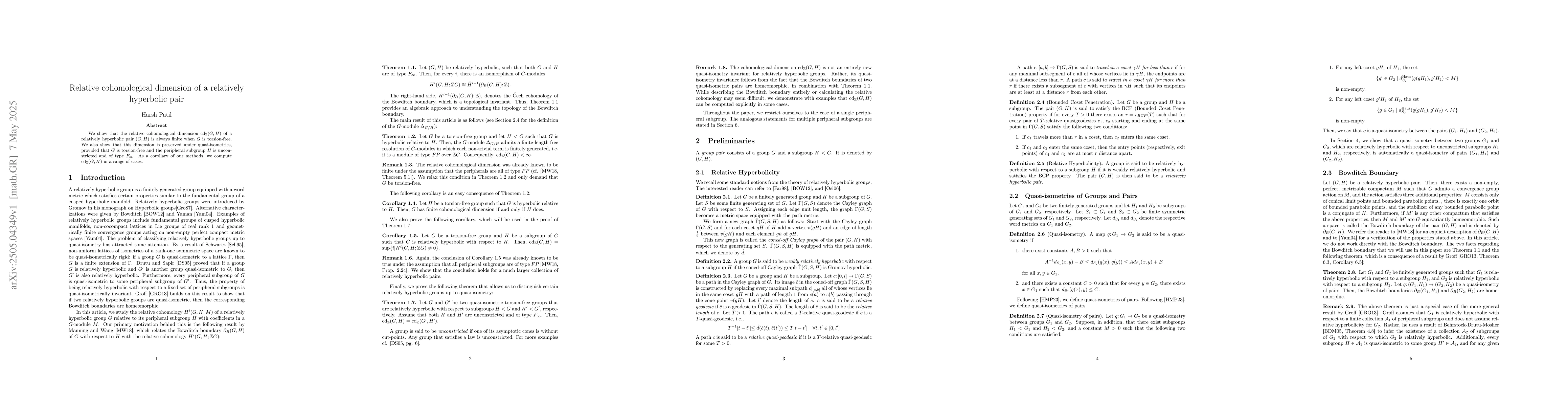 A study shows that the relative cohomological dimension of a relatively hyperbolic pair is always finite for torsion-free groups, and this dimension is preserved under certain types of transformations.