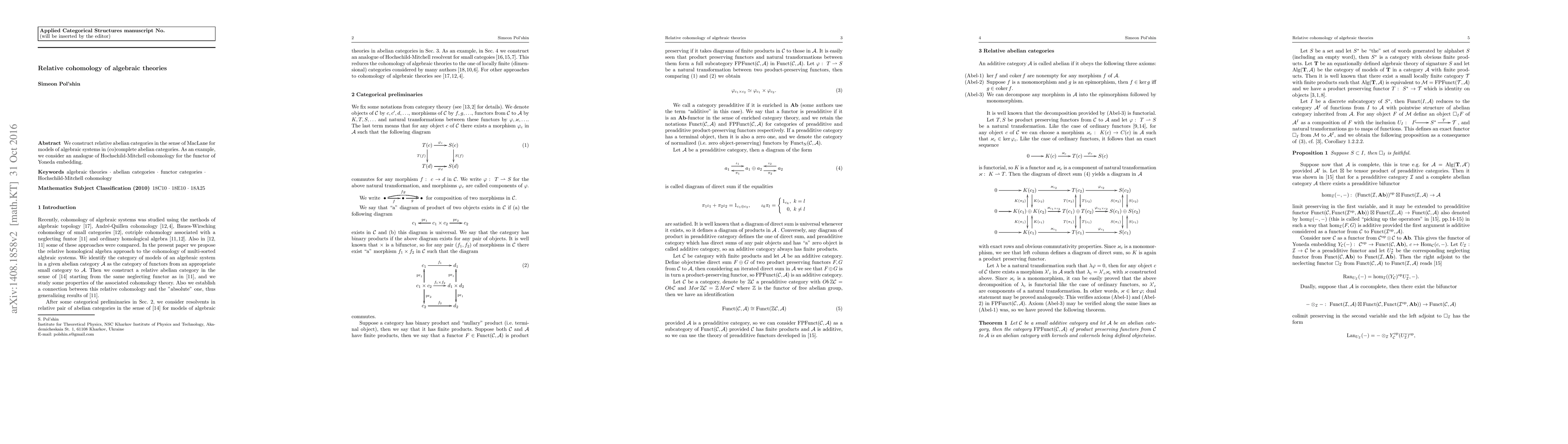 We construct relative abelian categories in the sense of MacLane for models of algebraic systems in (co)complete abelian categories. As an example, we consider an analogue of Hochschild-Mitchell cohomology for the functor of Yoneda embedding.
