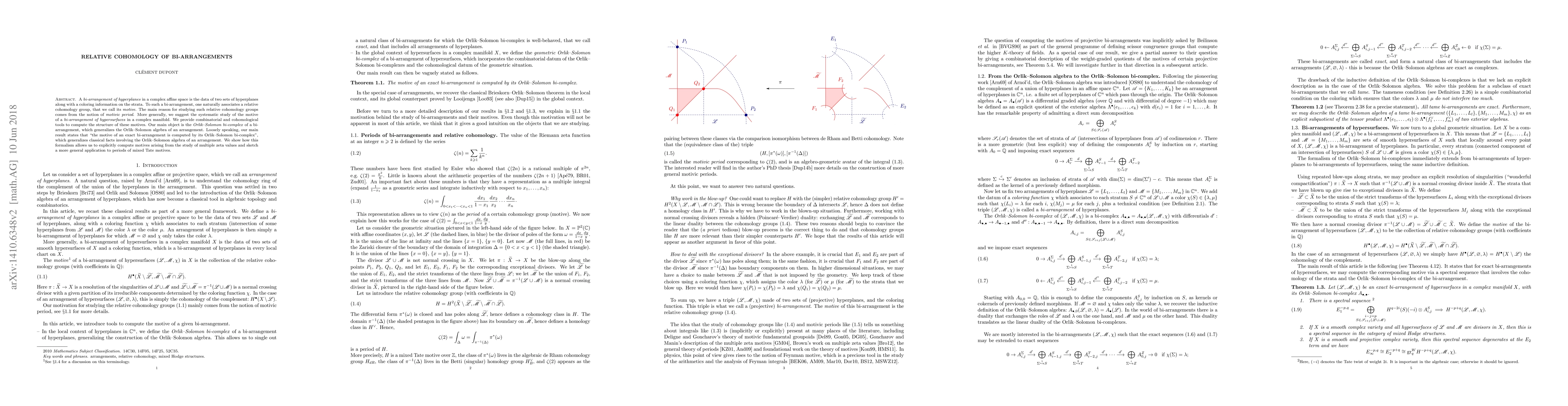 This paper explores the relative cohomology groups, termed motives, associated with bi-arrangements of hyperplanes in complex spaces, using combinatorial and cohomological tools. The main result establishes that the motive of an exact bi-arrangement is determined by its Orlik-Solomon bi-complex, extending classical results for arrangements.