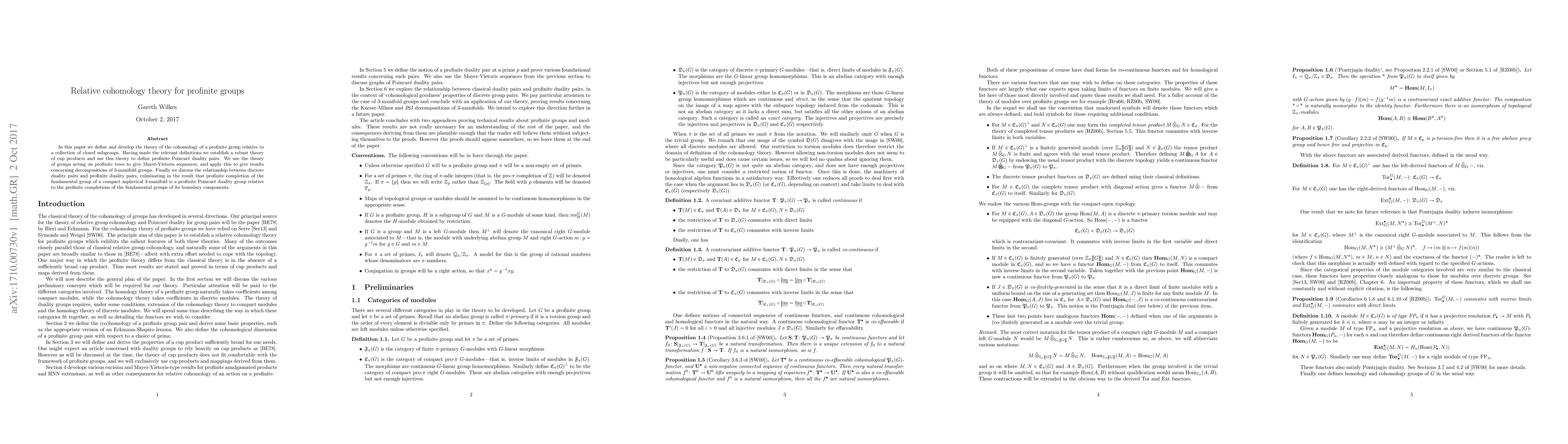 This paper develops the relative cohomology theory for profinite groups, establishing cup products and profinite Poincaré duality pairs. It applies this theory to analyze 3-manifold groups via profinite trees and Mayer-Vietoris sequences, concluding that the profinite completion of a compact aspherical 3-manifold's fundamental group is a profinite Poincaré duality group relative to its boundary components.