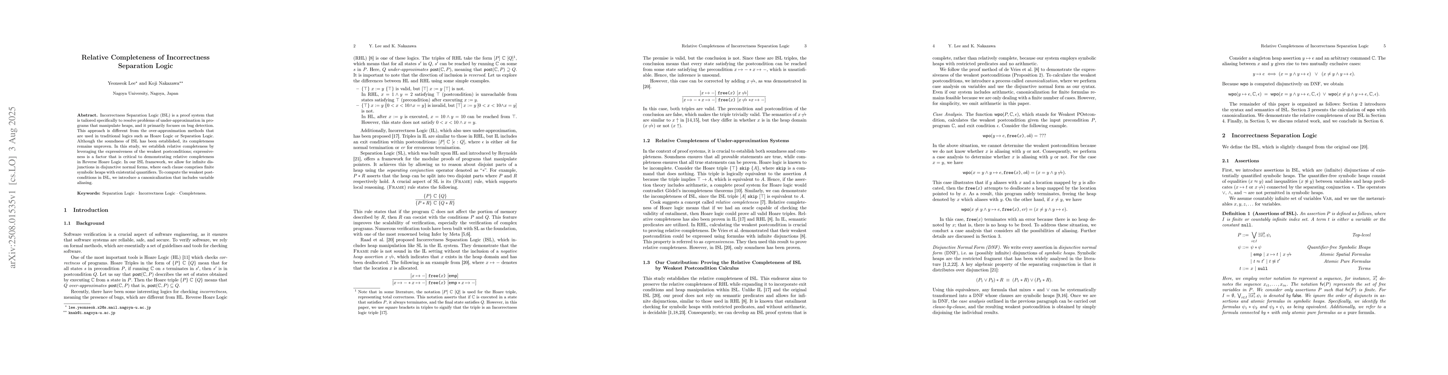 Incorrectness Separation Logic (ISL) is a proof system that is tailored specifically to resolve problems of under-approximation in programs that manipulate heaps, and it primarily focuses on bug detection. This approach is different from the over-approximation methods that are used in traditional logics such as Hoare Logic or Separation Logic. Although the soundness of ISL has been established, its completeness remains unproven. In this study, we establish relative completeness by leveraging the expressiveness of the weakest postconditions; expressiveness is a factor that is critical to demonstrating relative completeness in Reverse Hoare Logic. In our ISL framework, we allow for infinite disjunctions in disjunctive normal forms, where each clause comprises finite symbolic heaps with existential quantifiers. To compute the weakest postconditions in ISL, we introduce a canonicalization that includes variable aliasing.