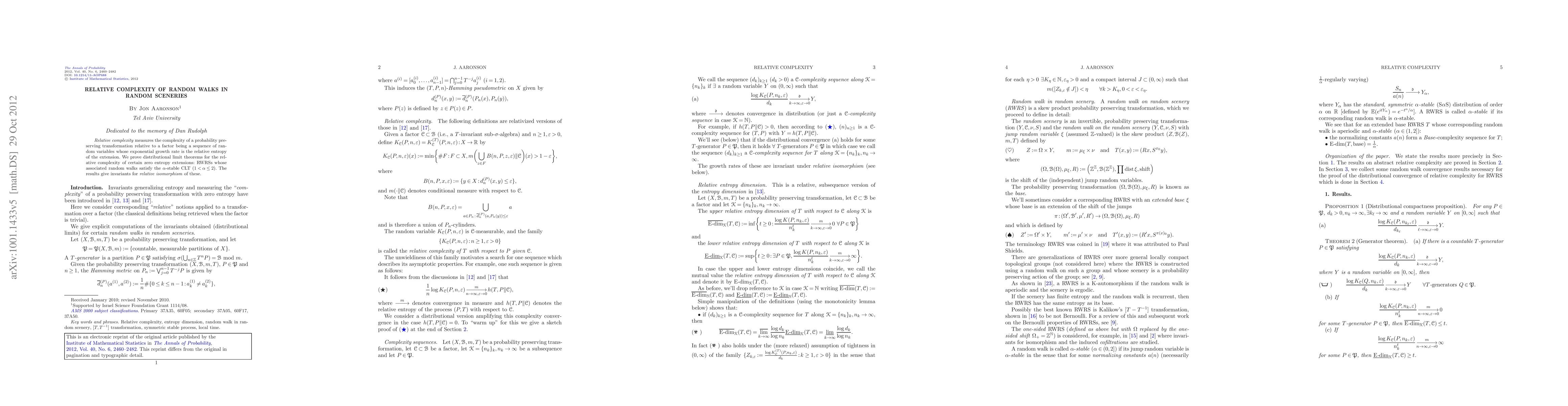 Relative complexity measures the complexity of a probability preserving transformation relative to a factor being a sequence of random variables whose exponential growth rate is the relative entropy of the extension. We prove distributional limit theorems for the relative complexity of certain zero entropy extensions: RWRSs whose associated random walks satisfy the \alpha-stable CLT ($1<\alpha\le2$). The results give invariants for relative isomorphism of these.