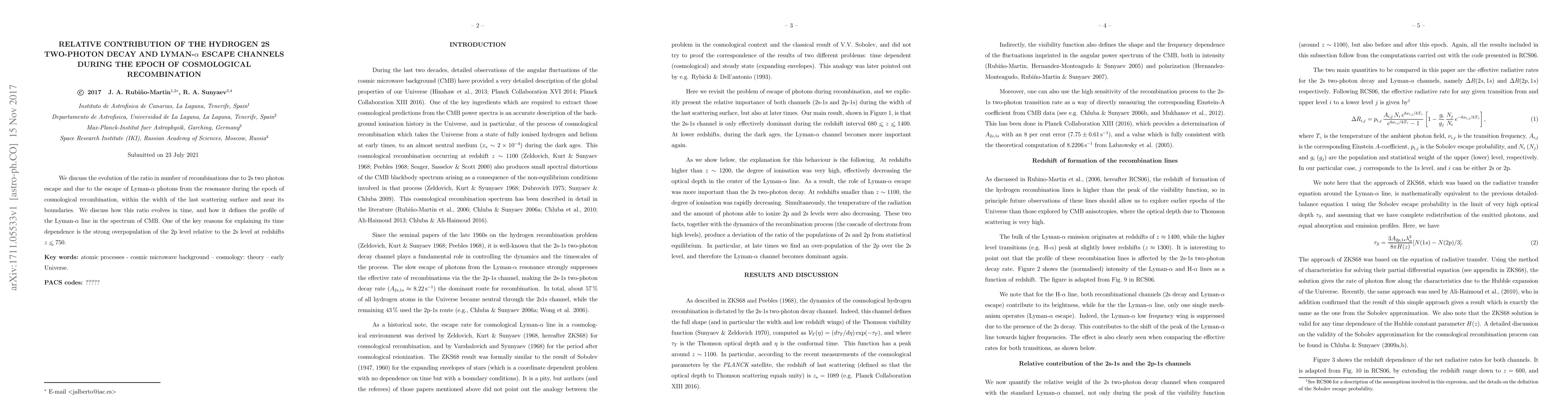 This paper examines the relative contributions of hydrogen 2S two-photon decay and Lyman-alpha photon escape during cosmological recombination, analyzing how their ratio evolves over time and influences the profile of the Lyman-$\alpha$ line in the CMB spectrum. The study highlights the overpopulation of the 2p level relative to the 2s level at redshifts below 750.