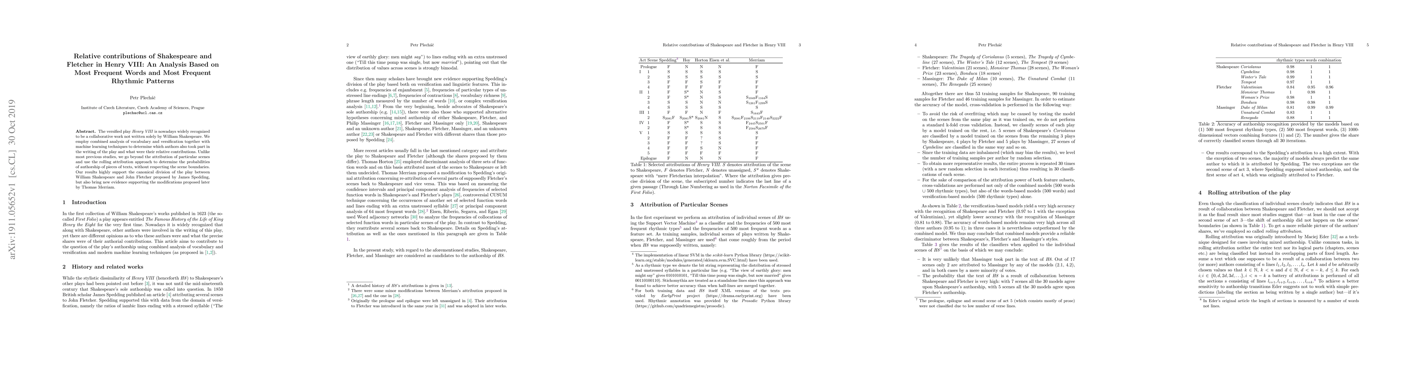 The versified play Henry VIII is nowadays widely recognized to be a collaborative work not written solely by William Shakespeare. We employ combined analysis of vocabulary and versification together with machine learning techniques to determine which authors also took part in the writing of the play and what were their relative contributions. Unlike most previous studies, we go beyond the attribution of particular scenes and use the rolling attribution approach to determine the probabilities of authorship of pieces of texts, without respecting the scene boundaries. Our results highly support the canonical division of the play between William Shakespeare and John Fletcher proposed by James Spedding, but also bring new evidence supporting the modifications proposed later by Thomas Merriam.