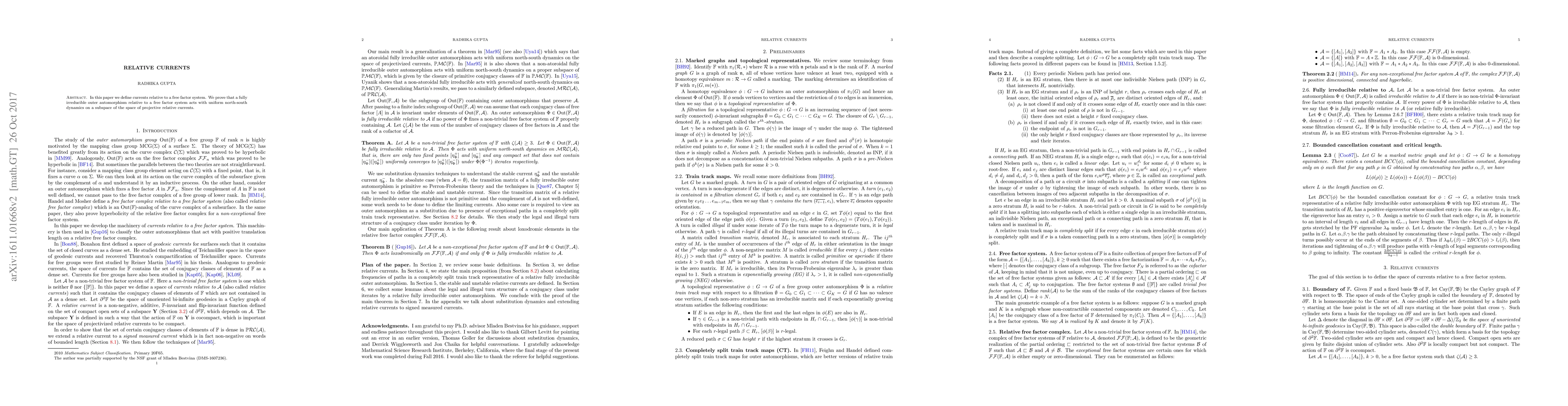 This paper defines relative currents in relation to free factor systems and demonstrates that fully irreducible outer automorphisms exhibit uniform north-south dynamics on a subspace of the space of projective relative currents.