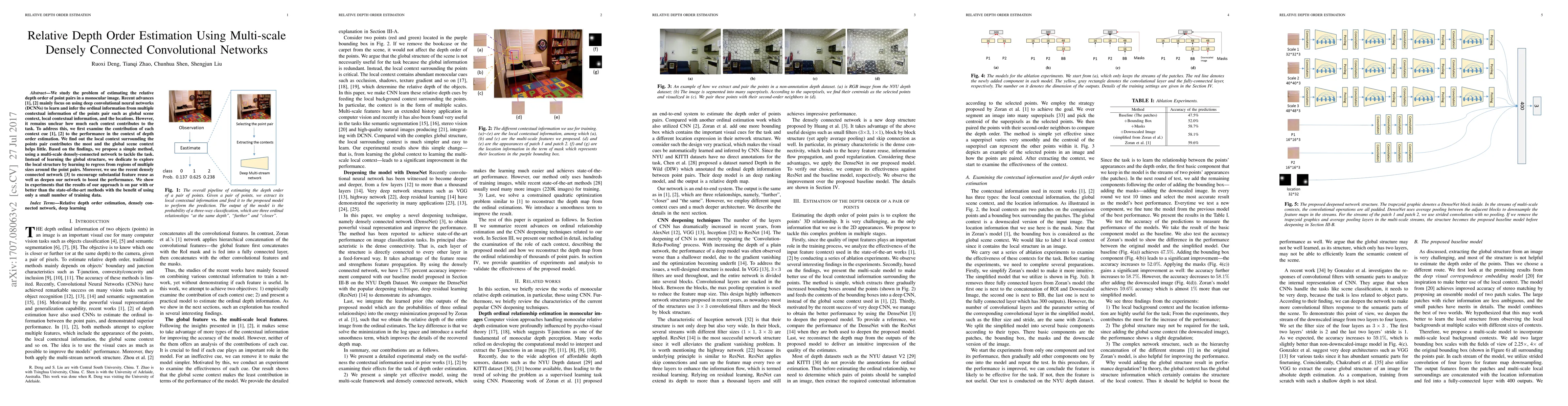 This paper proposes a new approach to estimating relative depth order using multi-scale densely connected convolutional networks, which outperforms state-of-the-art methods with limited training data.