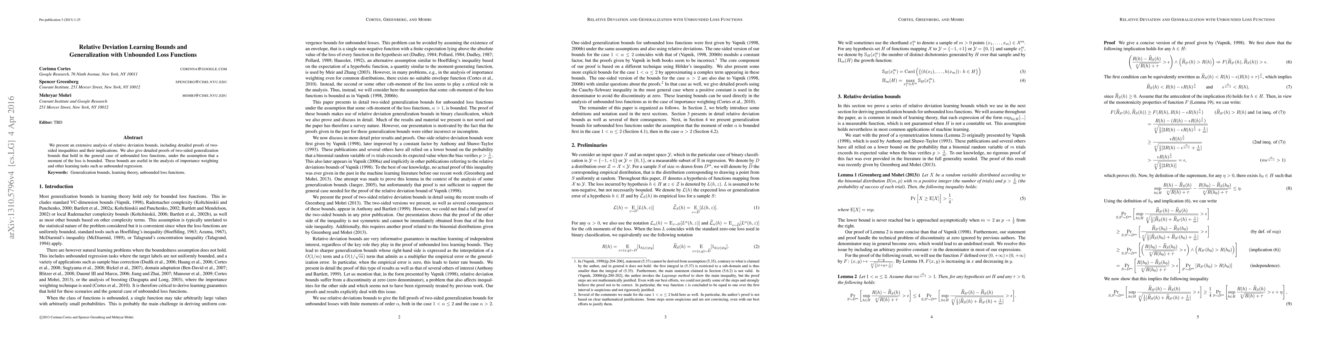 We present an extensive analysis of relative deviation bounds, including detailed proofs of two-sided inequalities and their implications. We also give detailed proofs of two-sided generalization bounds that hold in the general case of unbounded loss functions, under the assumption that a moment of the loss is bounded. These bounds are useful in the analysis of importance weighting and other learning tasks such as unbounded regression.