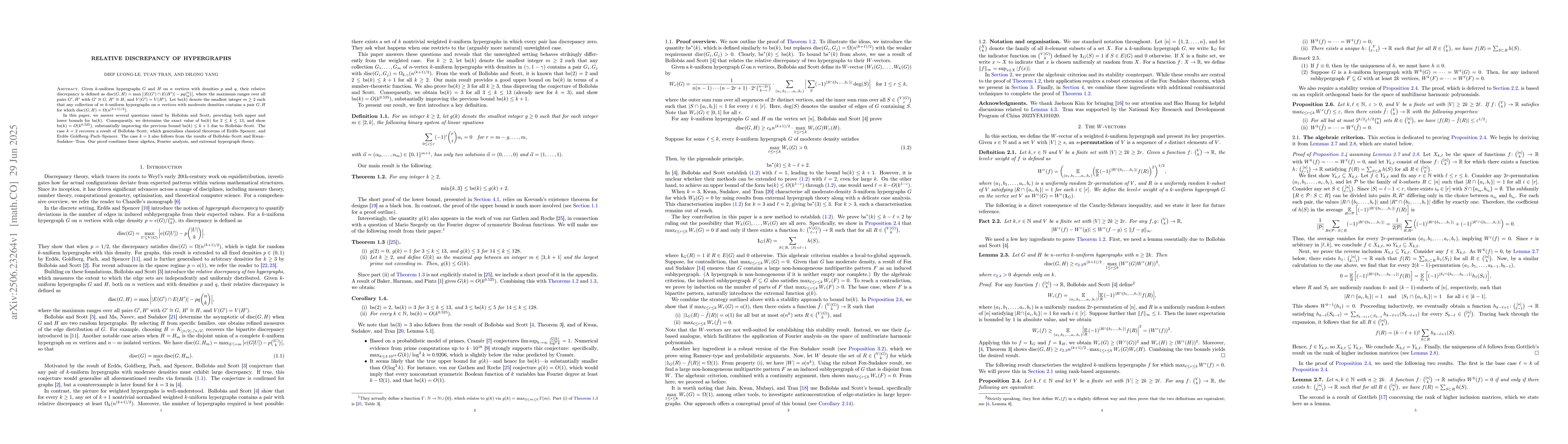 Given $k$-uniform hypergraphs $G$ and $H$ on $n$ vertices with densities $p$ and $q$, their relative discrepancy is defined as $\hbox{disc}(G,H)=\max\big||E(G')\cap E(H')|-pq\binom{n}{k}\big|$, where the maximum ranges over all pairs $G',H'$ with $G'\cong G$, $H'\cong H$, and $V(G')=V(H')$. Let $\hbox{bs}(k)$ denote the smallest integer $m \ge 2$ such that any collection of $m$ $k$-uniform hypergraphs on $n$ vertices with moderate densities contains a pair $G,H$ for which $\hbox{disc}(G,H) = \Omega(n^{(k+1)/2})$. In this paper, we answer several questions raised by Bollob\'as and Scott, providing both upper and lower bounds for $\hbox{bs}(k)$. Consequently, we determine the exact value of $\hbox{bs}(k)$ for $2\le k\le 13$, and show $\hbox{bs}(k)=O(k^{0.525})$, substantially improving the previous bound $\hbox{bs}(k)\le k+1$ due to Bollob\'as-Scott. The case $k=2$ recovers a result of Bollob\'as-Scott, which generalises classical theorems of Erd\H{o}s-Spencer, and Erd\H{o}s-Goldberg-Pach-Spencer. The case $k=3$ also follows from the results of Bollob\'as-Scott and Kwan-Sudakov-Tran. Our proof combines linear algebra, Fourier analysis, and extremal hypergraph theory.