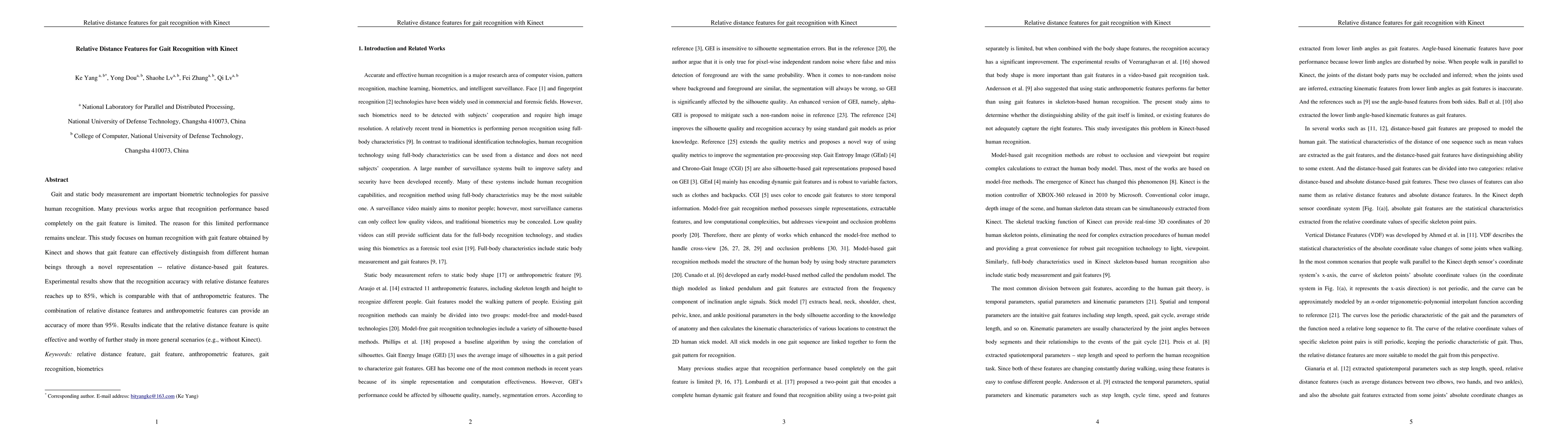 Gait and static body measurement are important biometric technologies for passive human recognition. Many previous works argue that recognition performance based completely on the gait feature is limited. The reason for this limited performance remains unclear. This study focuses on human recognition with gait feature obtained by Kinect and shows that gait feature can effectively distinguish from different human beings through a novel representation -- relative distance-based gait features. Experimental results show that the recognition accuracy with relative distance features reaches up to 85%, which is comparable with that of anthropometric features. The combination of relative distance features and anthropometric features can provide an accuracy of more than 95%. Results indicate that the relative distance feature is quite effective and worthy of further study in more general scenarios (e.g., without Kinect).