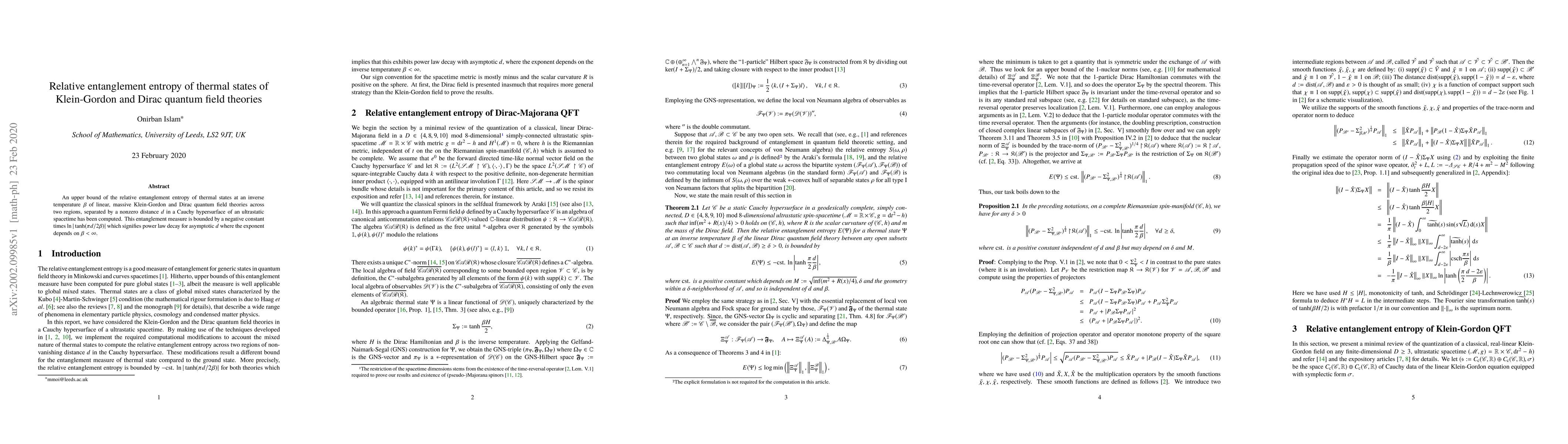Researchers computed an upper bound for entanglement entropy of thermal states in Klein-Gordon and Dirac quantum field theories, finding a power-law decay dependence on distance and inverse temperature.