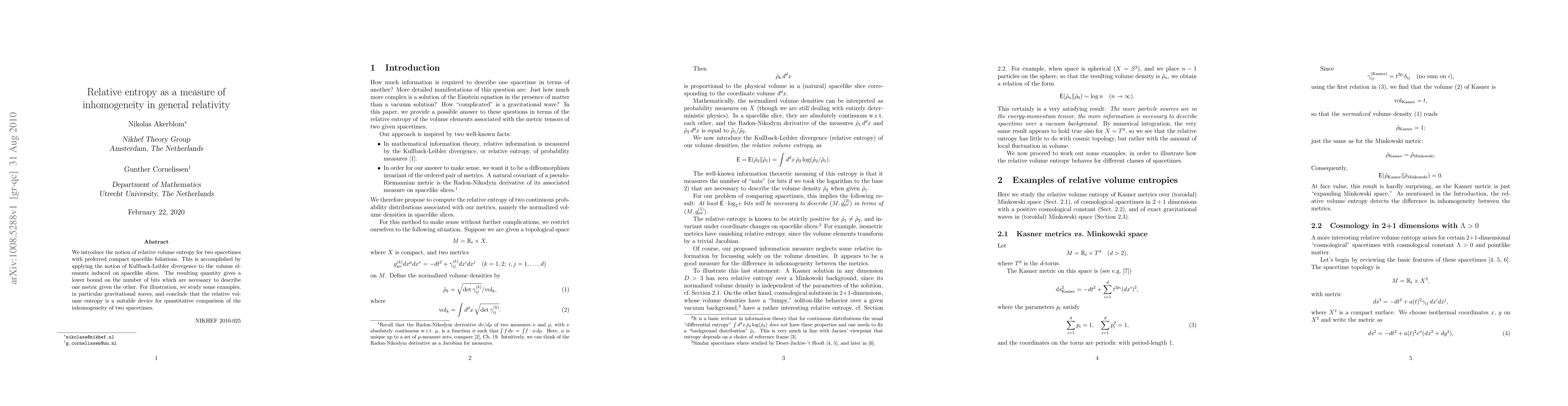 We introduce the notion of relative volume entropy for two spacetimes with preferred compact spacelike foliations. This is accomplished by applying the notion of Kullback-Leibler divergence to the volume elements induced on spacelike slices. The resulting quantity gives a lower bound on the number of bits which are necessary to describe one metric given the other. For illustration, we study some examples, in particular gravitational waves, and conclude that the relative volume entropy is a suitable device for quantitative comparison of the inhomogeneity of two spacetimes.