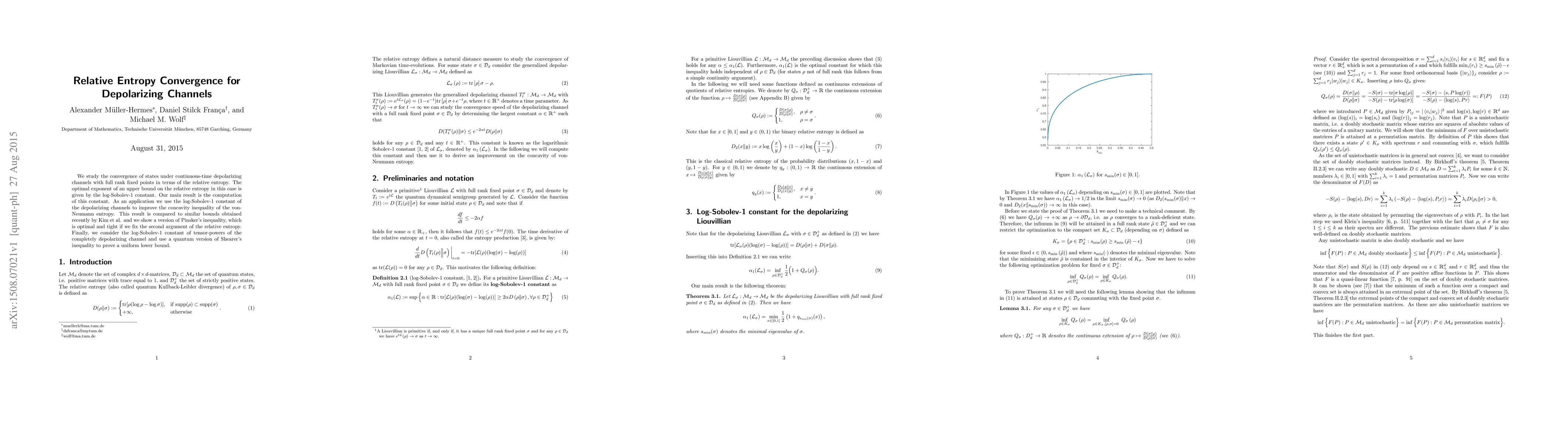 We study the convergence of states under continuous-time depolarizing channels with full rank fixed points in terms of the relative entropy. The optimal exponent of an upper bound on the relative entropy in this case is given by the log-Sobolev-1 constant. Our main result is the computation of this constant. As an application we use the log-Sobolev-1 constant of the depolarizing channels to improve the concavity inequality of the von-Neumann entropy. This result is compared to similar bounds obtained recently by Kim et al. and we show a version of Pinsker's inequality, which is optimal and tight if we fix the second argument of the relative entropy. Finally, we consider the log-Sobolev-1 constant of tensor-powers of the completely depolarizing channel and use a quantum version of Shearer's inequality to prove a uniform lower bound.