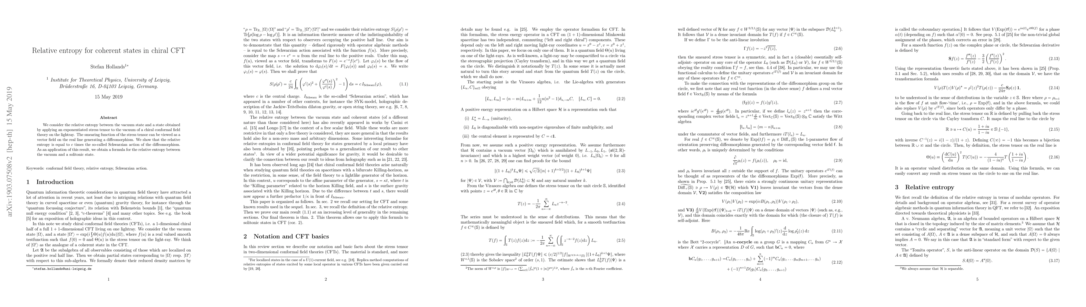 We consider the relative entropy between the vacuum state and a state obtained by applying an exponentiated stress tensor to the vacuum of a chiral conformal field theory on the lightray. The smearing function of the stress tensor can be viewed as a vector field on the real line generating a diffeomorphism. We show that the relative entropy is equal to $c$ times the so-called Schwarzian action of the diffeomorphism. As an application of this result, we obtain a formula for the relative entropy between the vacuum and a solitonic state.