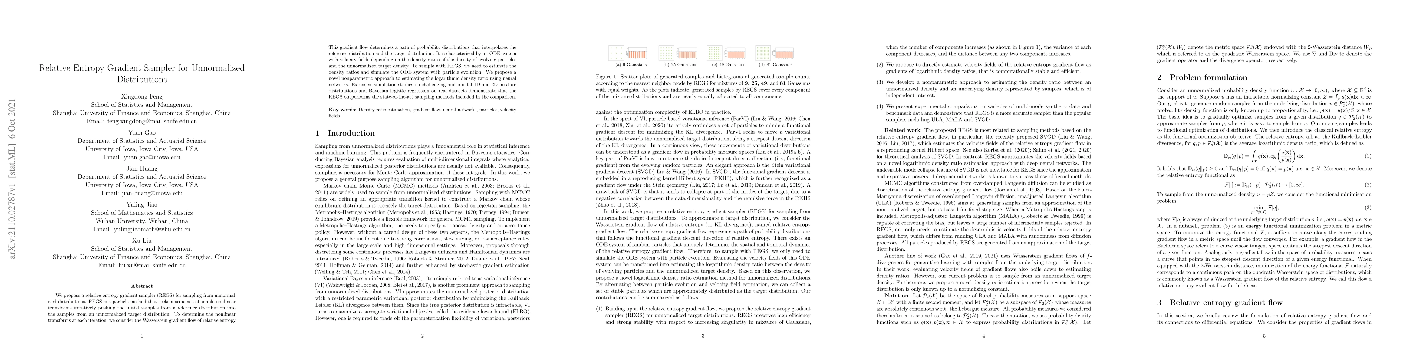 The paper introduces the Relative Entropy Gradient Sampler (REGS) for sampling from unnormalized distributions, utilizing a particle method and Wasserstein gradient flow to iteratively transform samples from a reference distribution into the target distribution. The method employs neural networks to estimate density ratios, demonstrating superior performance over state-of-the-art methods in simulations.