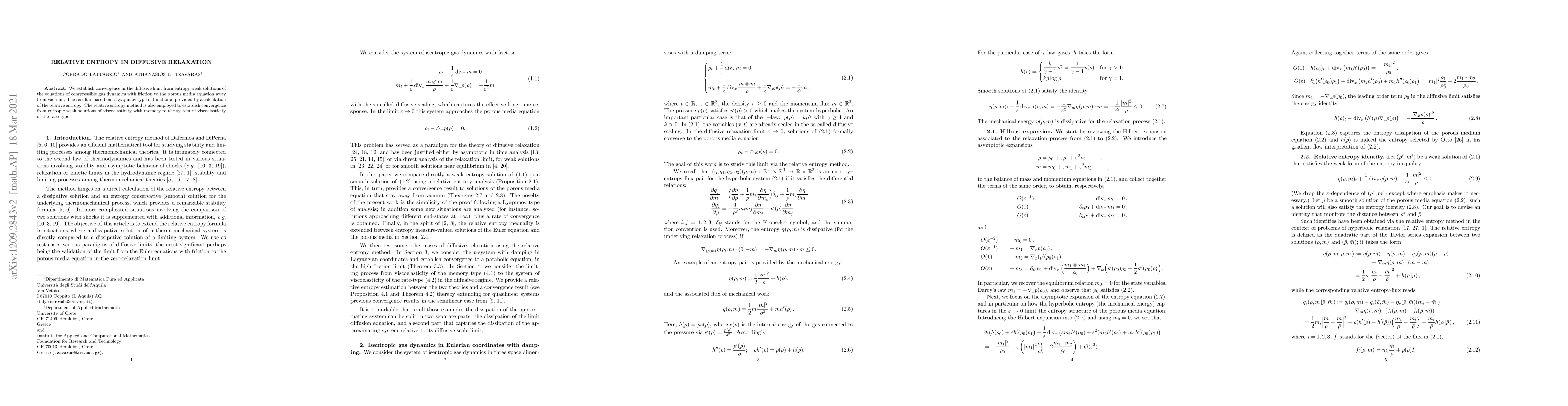 We establish convergence in the diffusive limit from entropy weak solutions of the equations of compressible gas dynamics with friction to the porous media equation away from vacuum. The result is based on a Lyapunov type of functional provided by a calculation of the relative entropy. The relative entropy method is also employed to establish convergence from entropic weak solutions of viscoelasticity with memory to the system of viscoelasticity of the rate-type.