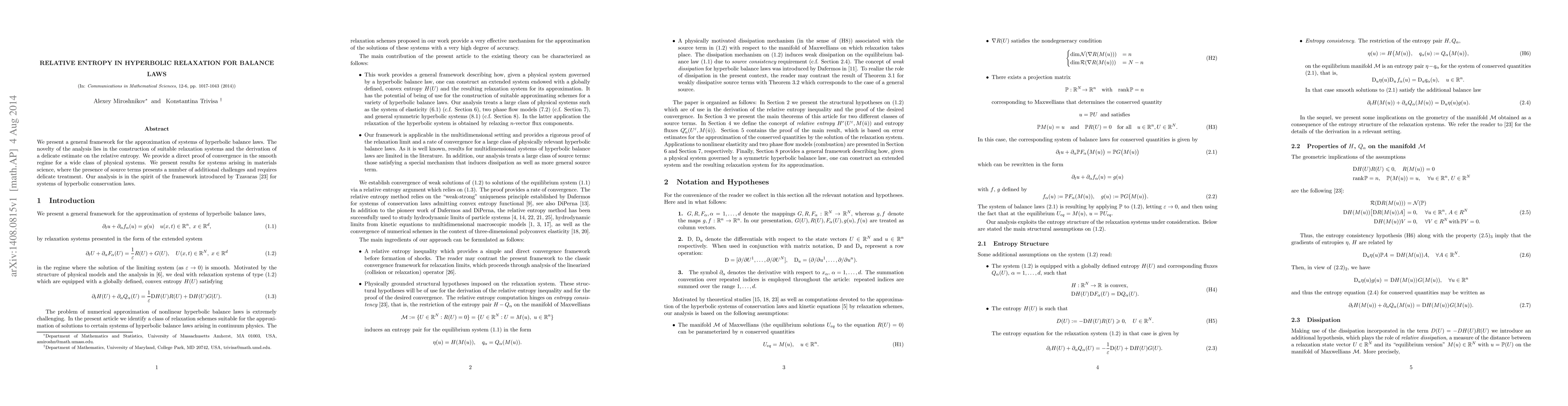 We present a general framework for the approximation of systems of hyperbolic balance laws. The novelty of the analysis lies in the construction of suitable relaxation systems and the derivation of a delicate estimate on the relative entropy. We provide a direct proof of convergence in the smooth regime for a wide class of physical systems. We present results for systems arising in materials science, where the presence of source terms presents a number of additional challenges and requires delicate treatment. Our analysis is in the spirit of the framework introduced by Tzavaras [A. Tzavaras, Commun. Math. Sci., 3-2, 2005] for systems of hyperbolic conservation laws.