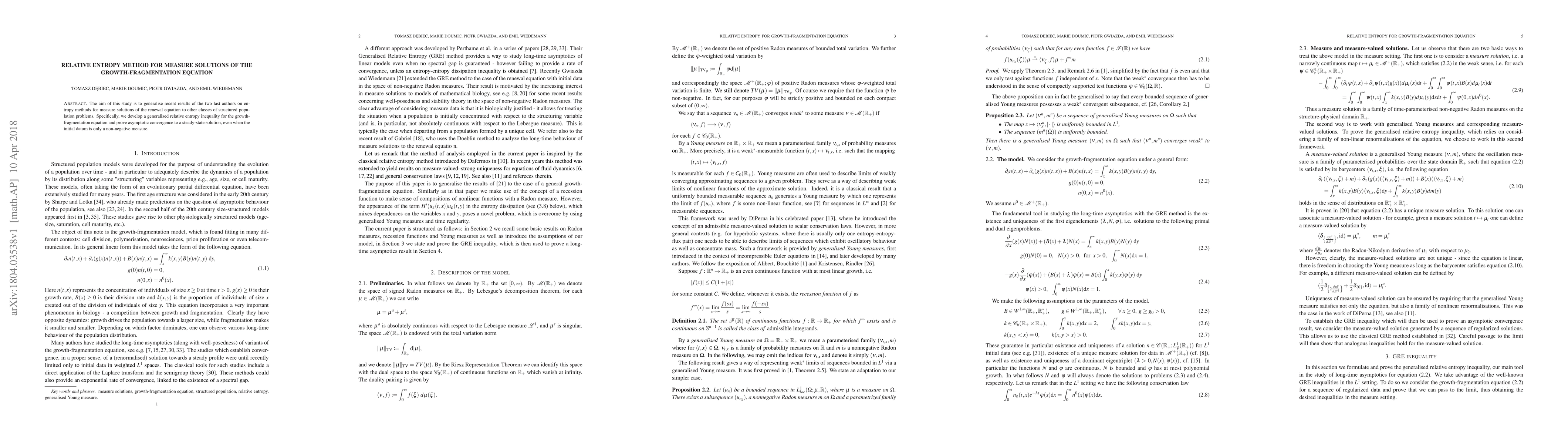 The aim of this study is to generalise recent results of the two last authors on en-tropy methods for measure solutions of the renewal equation to other classes of structured population problems. Specifically, we develop a generalised relative entropy inequality for the growth-fragmentation equation and prove asymptotic convergence to a steady-state solution, even when the initial datum is only a non-negative measure.