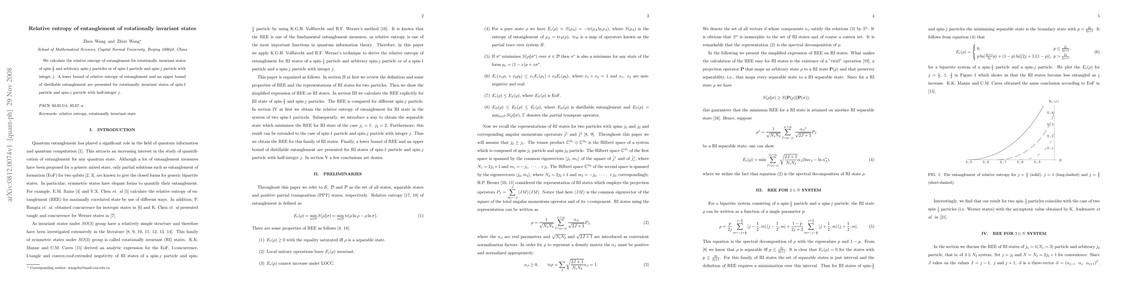 This paper calculates the relative entropy of entanglement for rotationally invariant states of spin-1/2 and arbitrary spin-$j$ particles, presenting bounds for spin-1 and spin-$j$ states with half-integer $j$. It provides insights into the entanglement properties of these states.