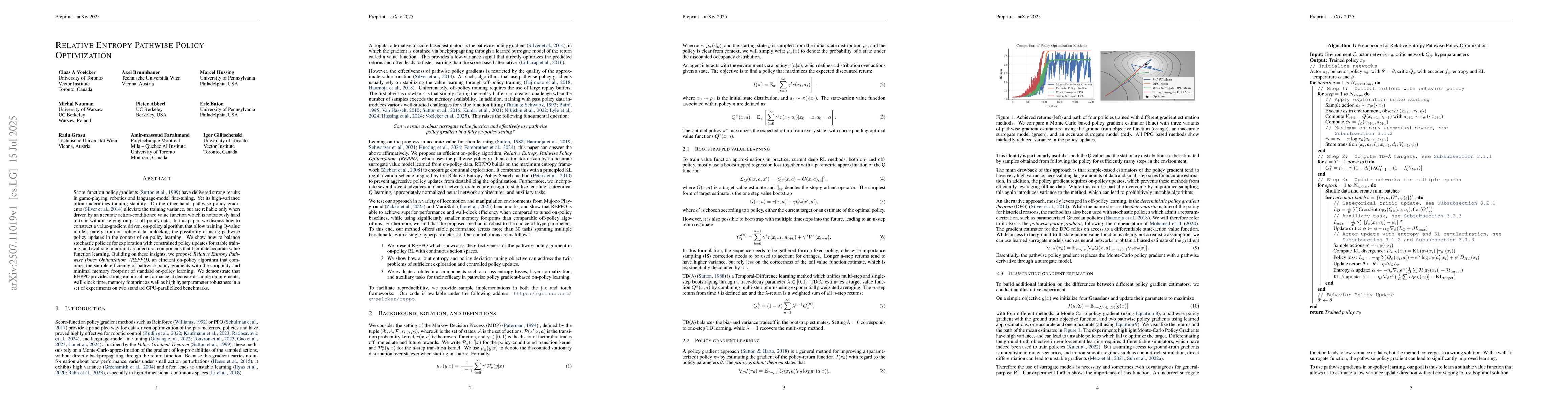 Score-function policy gradients have delivered strong results in game-playing, robotics and language-model fine-tuning. Yet its high-variance often undermines training stability. On the other hand, pathwise policy gradients alleviate the training variance, but are reliable only when driven by an accurate action-conditioned value function which is notoriously hard to train without relying on past off-policy data. In this paper, we discuss how to construct a value-gradient driven, on-policy algorithm that allow training Q-value models purely from on-policy data, unlocking the possibility of using pathwise policy updates in the context of on-policy learning. We show how to balance stochastic policies for exploration with constrained policy updates for stable training, and evaluate important architectural components that facilitate accurate value function learning. Building on these insights, we propose Relative Entropy Pathwise Policy Optimization (REPPO), an efficient on-policy algorithm that combines the sample-efficiency of pathwise policy gradients with the simplicity and minimal memory footprint of standard on-policy learning. We demonstrate that REPPO provides strong empirical performance at decreased sample requirements, wall-clock time, memory footprint as well as high hyperparameter robustness in a set of experiments on two standard GPU-parallelized benchmarks.