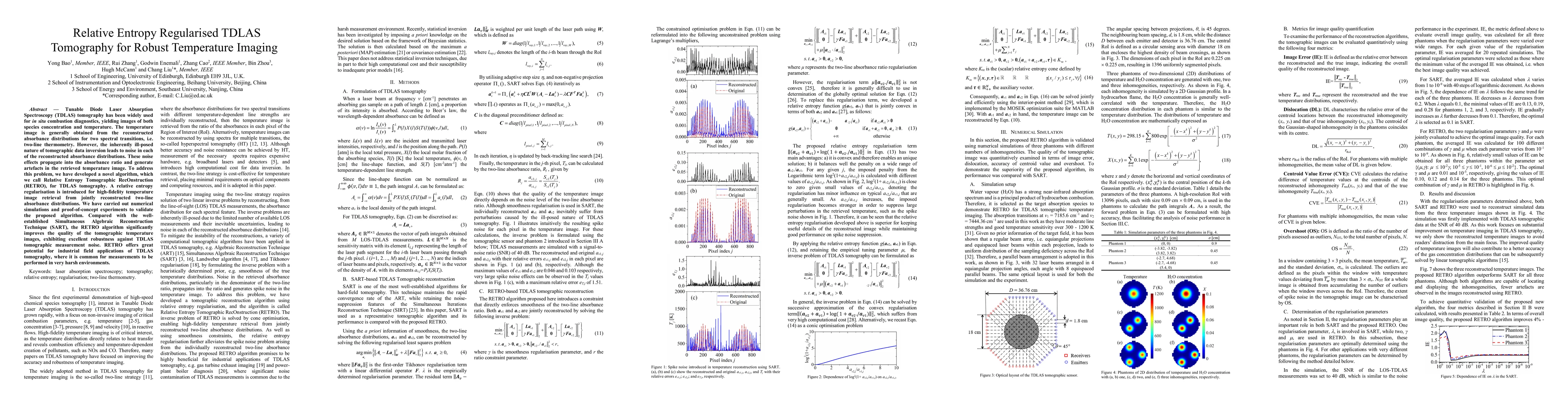Tunable Diode Laser Absorption Spectroscopy (TDLAS) tomography has been widely used for in situ combustion diagnostics, yielding images of both species concentration and temperature. The temperature image is generally obtained from the reconstructed absorbance distributions for two spectral transitions, i.e. two-line thermometry. However, the inherently ill-posed nature of tomographic data inversion leads to noise in each of the reconstructed absorbance distributions. These noise effects propagate into the absorbance ratio and generate artefacts in the retrieved temperature image. To address this problem, we have developed a novel algorithm, which we call Relative Entropy Tomographic RecOnstruction (RETRO), for TDLAS tomography. A relative entropy regularisation is introduced for high-fidelity temperature image retrieval from jointly reconstructed two-line absorbance distributions. We have carried out numerical simulations and proof-of-concept experiments to validate the proposed algorithm. Compared with the well-established Simultaneous Algebraic Reconstruction Technique (SART), the RETRO algorithm significantly improves the quality of the tomographic temperature images, exhibiting excellent robustness against TDLAS tomographic measurement noise. RETRO offers great potential for industrial field applications of TDLAS tomography, where it is common for measurements to be performed in very harsh environments.