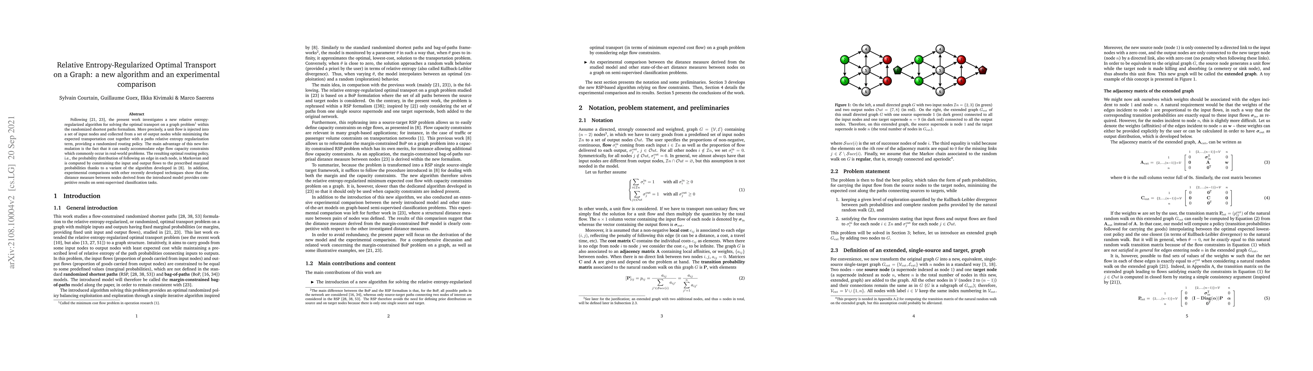 Following [21, 23], the present work investigates a new relative entropy-regularized algorithm for solving the optimal transport on a graph problem within the randomized shortest paths formalism. More precisely, a unit flow is injected into a set of input nodes and collected from a set of output nodes while minimizing the expected transportation cost together with a paths relative entropy regularization term, providing a randomized routing policy. The main advantage of this new formulation is the fact that it can easily accommodate edge flow capacity constraints which commonly occur in real-world problems. The resulting optimal routing policy, i.e., the probability distribution of following an edge in each node, is Markovian and is computed by constraining the input and output flows to the prescribed marginal probabilities thanks to a variant of the algorithm developed in [8]. In addition, experimental comparisons with other recently developed techniques show that the distance measure between nodes derived from the introduced model provides competitive results on semi-supervised classification tasks.