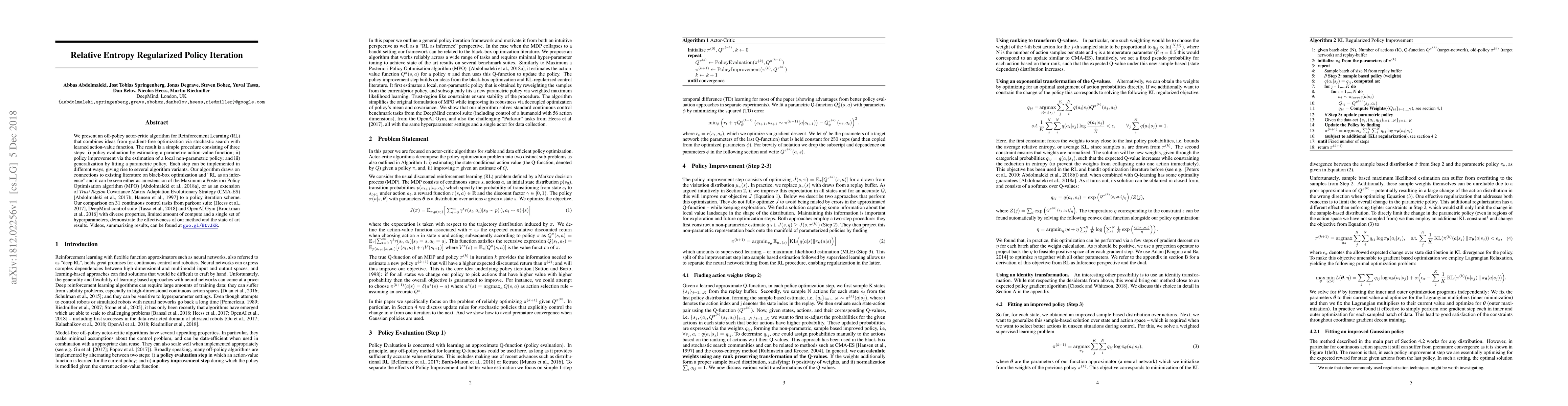 We present an off-policy actor-critic algorithm for Reinforcement Learning (RL) that combines ideas from gradient-free optimization via stochastic search with learned action-value function. The result is a simple procedure consisting of three steps: i) policy evaluation by estimating a parametric action-value function; ii) policy improvement via the estimation of a local non-parametric policy; and iii) generalization by fitting a parametric policy. Each step can be implemented in different ways, giving rise to several algorithm variants. Our algorithm draws on connections to existing literature on black-box optimization and 'RL as an inference' and it can be seen either as an extension of the Maximum a Posteriori Policy Optimisation algorithm (MPO) [Abdolmaleki et al., 2018a], or as an extension of Trust Region Covariance Matrix Adaptation Evolutionary Strategy (CMA-ES) [Abdolmaleki et al., 2017b; Hansen et al., 1997] to a policy iteration scheme. Our comparison on 31 continuous control tasks from parkour suite [Heess et al., 2017], DeepMind control suite [Tassa et al., 2018] and OpenAI Gym [Brockman et al., 2016] with diverse properties, limited amount of compute and a single set of hyperparameters, demonstrate the effectiveness of our method and the state of art results. Videos, summarizing results, can be found at goo.gl/HtvJKR .
