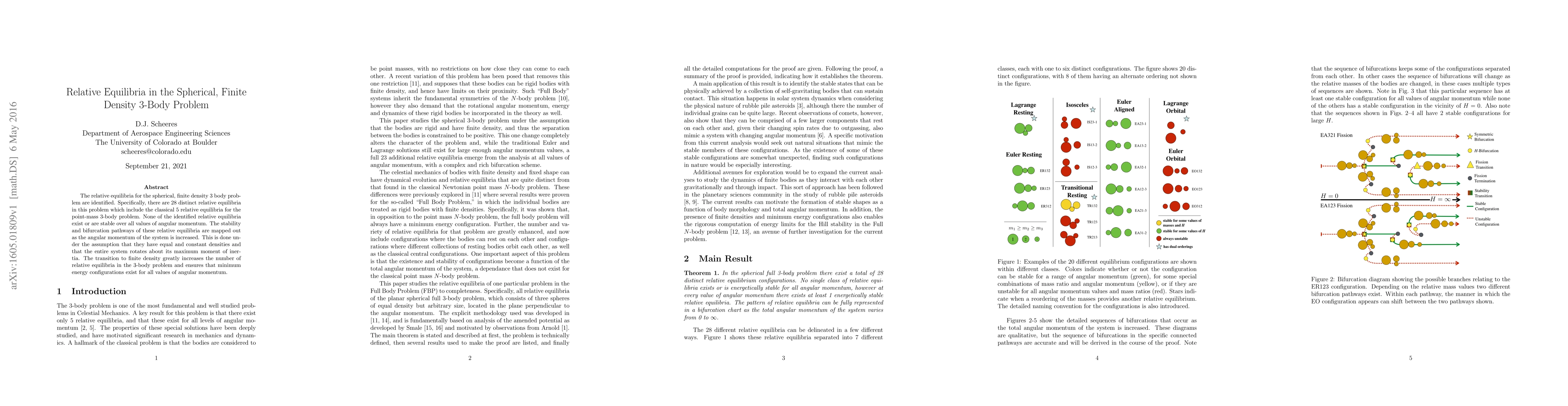 This paper identifies 28 distinct relative equilibria in the spherical, finite density 3-body problem, including the classical 5 equilibria for point masses. The stability and bifurcation pathways of these equilibria are mapped as angular momentum increases, revealing that minimum energy configurations exist for all angular momentum values.