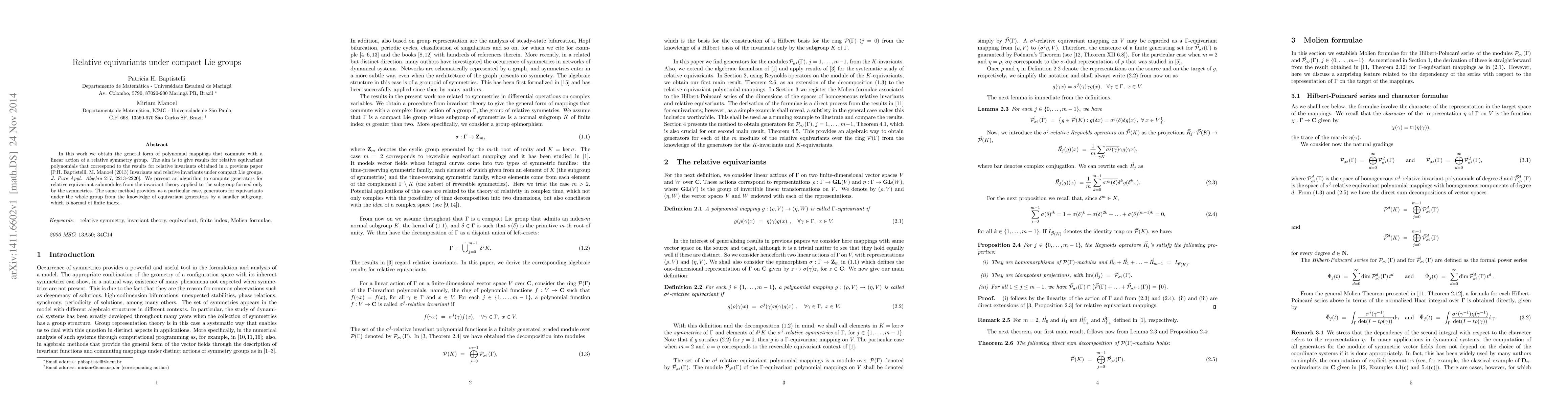 In this work we obtain the general form of polynomial mappings that commute with a linear action of a relative symmetry group. The aim is to give results for relative equivariant polynomials that correspond to the results for relative invariants obtained in a previous paper [P.H. Baptistelli, M. Manoel (2013) Invariants and relative invariants under compact Lie groups, J. Pure Appl. Algebra 217, 2213{2220]. We present an algorithm to compute generators for relative equivariant submodules from the invariant theory applied to the subgroup formed only by the symmetries. The same method provides, as a particular case, generators for equivariants under the whole group from the knowledge of equivariant generators by a smaller subgroup, which is normal of finite index.