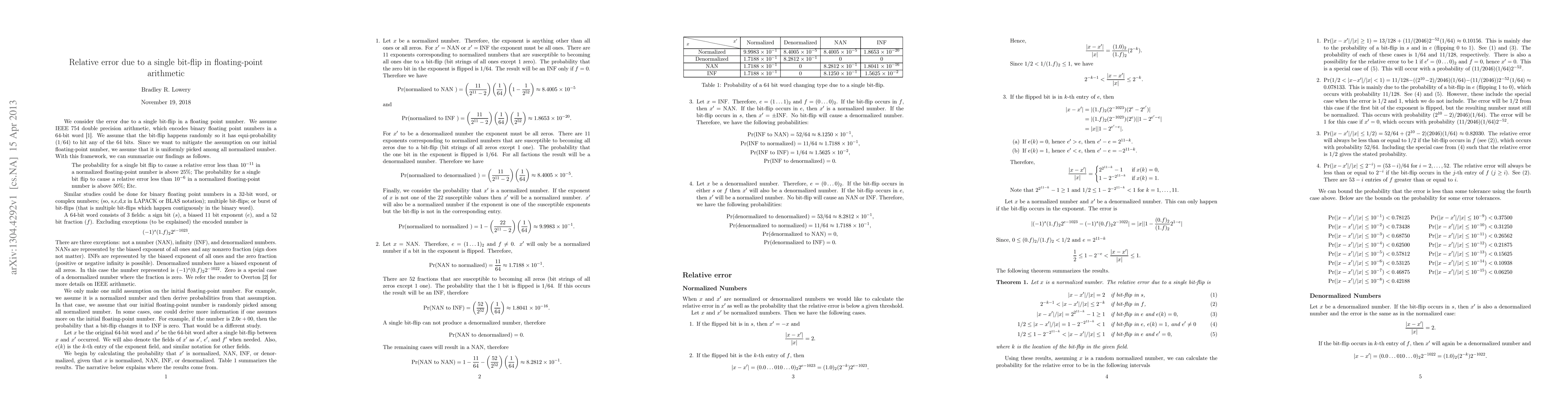 We consider the error due to a single bit-flip in a floating point number. We assume IEEE 754 double precision arithmetic, which encodes binary floating point numbers in a 64-bit word. We assume that the bit-flip happens randomly so it has equi-probability (1/64) to hit any of the 64 bits. Since we want to mitigate the assumption on our initial floating-point number, we assume that it is uniformly picked among all normalized number. With this framework, we can summarize our findings as follows. The probability for a single bit flip to cause a relative error less than 10^-11 in a normalized floating-point number is above 25%; The probability for a single bit flip to cause a relative error less than 10^-6 in a normalized floating-point number is above 50%; Etc.