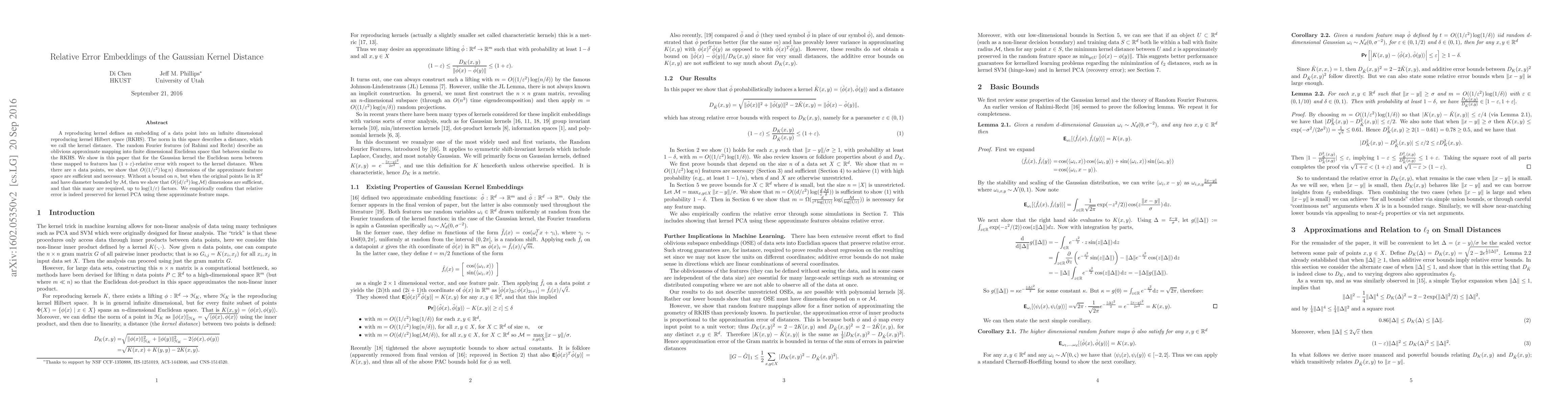 A reproducing kernel can define an embedding of a data point into an infinite dimensional reproducing kernel Hilbert space (RKHS). The norm in this space describes a distance, which we call the kernel distance. The random Fourier features (of Rahimi and Recht) describe an oblivious approximate mapping into finite dimensional Euclidean space that behaves similar to the RKHS. We show in this paper that for the Gaussian kernel the Euclidean norm between these mapped to features has $(1+\epsilon)$-relative error with respect to the kernel distance. When there are $n$ data points, we show that $O((1/\epsilon^2) \log(n))$ dimensions of the approximate feature space are sufficient and necessary. Without a bound on $n$, but when the original points lie in $\mathbb{R}^d$ and have diameter bounded by $\mathcal{M}$, then we show that $O((d/\epsilon^2) \log(\mathcal{M}))$ dimensions are sufficient, and that this many are required, up to $\log(1/\epsilon)$ factors.