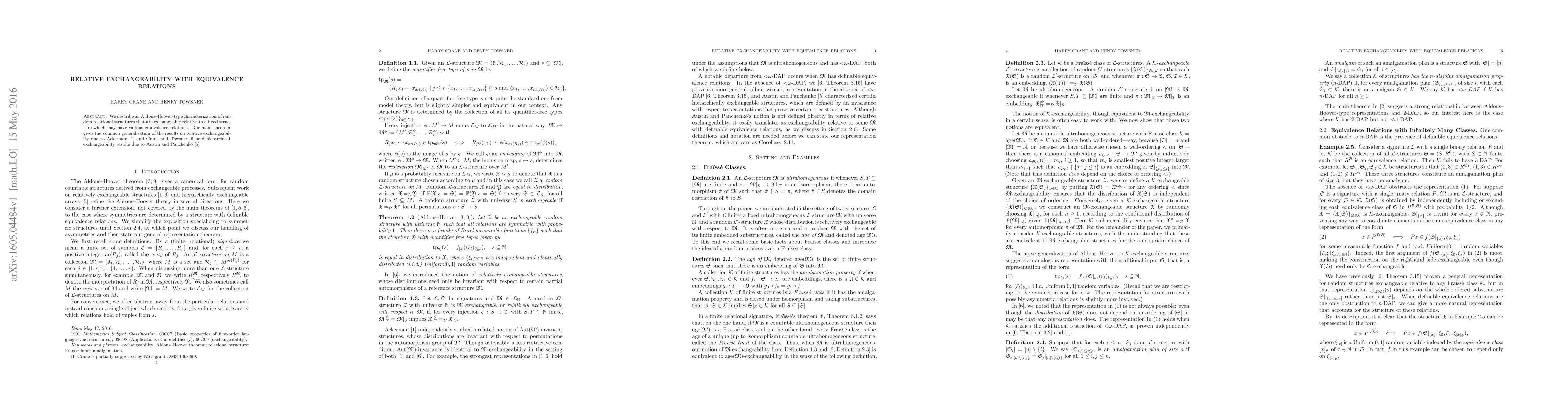 This paper presents a unified theorem for relative exchangeability in random relational structures, generalizing previous works by Ackerman, Crane & Towsner, and Austin & Panchenko. It describes an Aldous-Hoover-type characterization under equivalence relations.