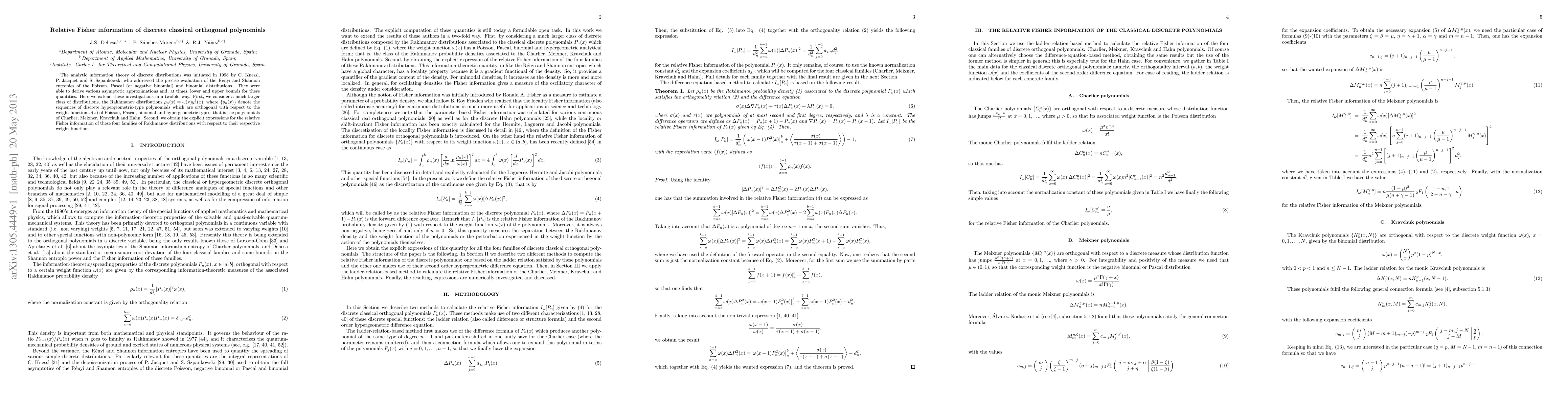 The analytic information theory of discrete distributions was initiated in 1998 by C. Knessl, P. Jacquet and S. Szpankowski who addressed the precise evaluation of the Renyi and Shannon entropies of the Poisson, Pascal (or negative binomial) and binomial distributions. They were able to derive various asymptotic approximations and, at times, lower and upper bounds for these quantities. Here we extend these investigations in a twofold way. First, we consider a much larger class of distributions, the Rakhmanov distributions $\rho_n(x)=\omega(x)y_n^2(x)$, where $\{y_n(x)\}$ denote the sequences of discrete hypergeometric-type polynomials which are orthogonal with respect to the weight function $\omega(x)$ of Poisson, Pascal, binomial and hypergeometric types; that is the polynomials of Charlier, Meixner, Kravchuk and Hahn. Second, we obtain the explicit expressions for the relative Fisher information of these four families of Rakhmanov distributions with respect to their respective weight functions.
