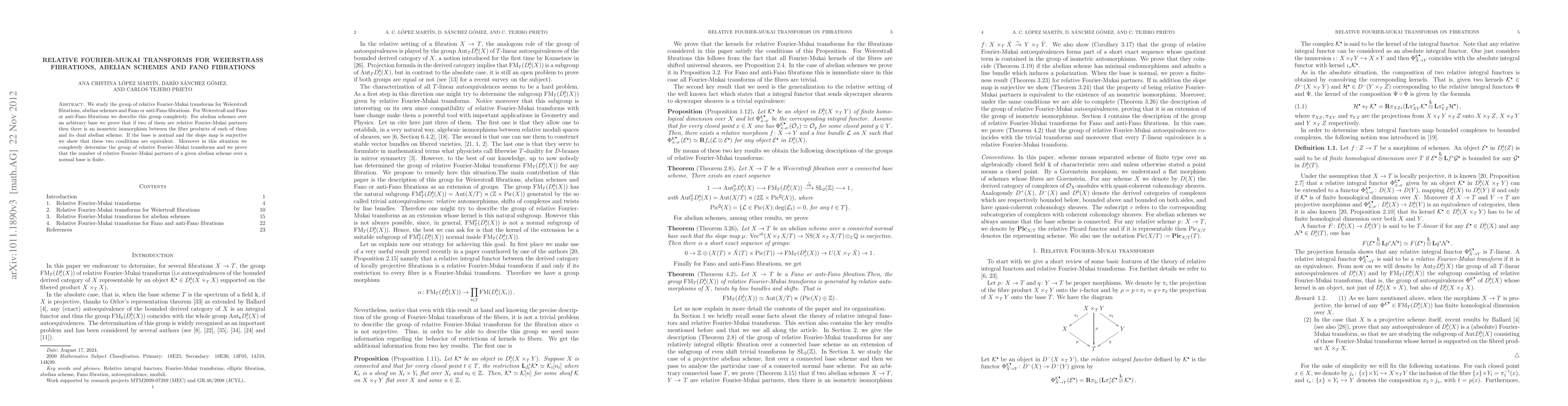 This paper examines the group of relative Fourier-Mukai transforms for Weierstrass and Fano/anti-Fano fibrations, completely describing this group for the former and proving that for abelian schemes, relative Fourier-Mukai partners exhibit an isometric isomorphism between their fibre products and dual schemes. The authors further demonstrate that under normal base conditions with a surjective slope map, these abelian schemes have a finite number of relative Fourier-Mukai partners, and completely determine the group of relative Fourier-Mukai transforms in this context.