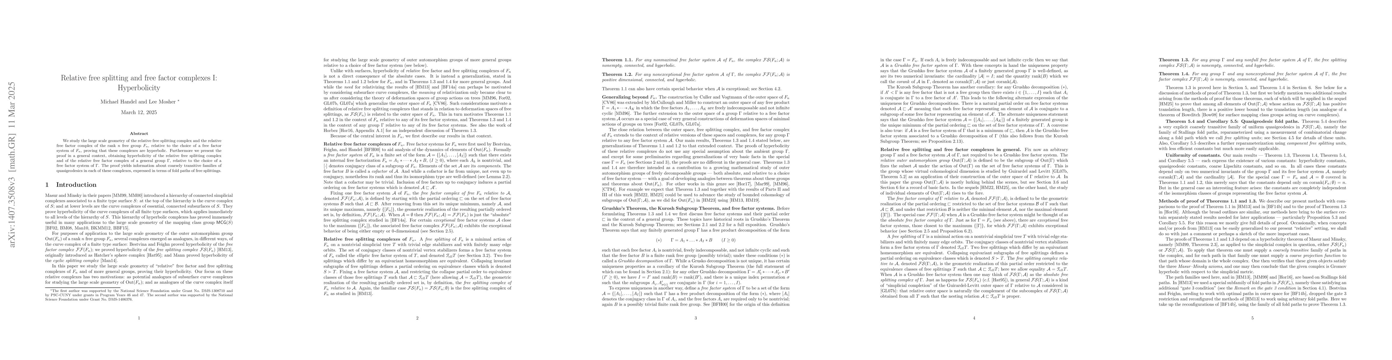 This paper demonstrates that the relative free splitting complex and the relative complex of free factor systems of a rank $n$ free group $F_n$, as well as those of a general group $\Gamma$, are hyperbolic. The proof also provides insights into coarsely transitive families of quasigeodesics in these complexes.