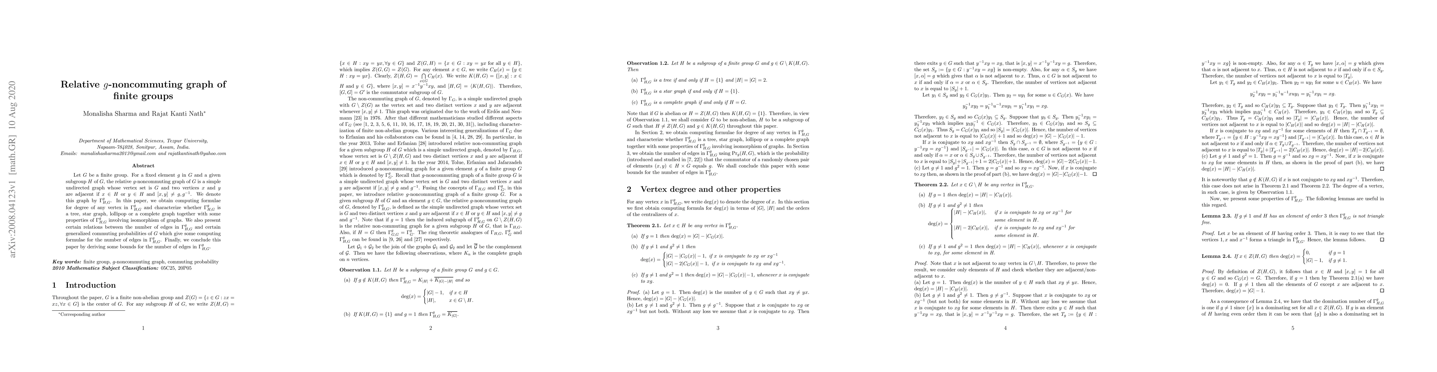 Let $G$ be a finite group. For a fixed element $g$ in $G$ and a given subgroup $H$ of $G$, the relative $g$-noncommuting graph of $G$ is a simple undirected graph whose vertex set is $G$ and two vertices $x$ and $y$ are adjacent if $x \in H$ or $y \in H$ and $[x,y] \neq g, g^{-1}$. We denote this graph by $\Gamma_{H, G}^g$. In this paper, we obtain computing formulae for degree of any vertex in $\Gamma_{H, G}^g$ and characterize whether $\Gamma_{H, G}^g$ is a tree, star graph, lollipop or a complete graph together with some properties of $\Gamma_{H, G}^g$ involving isomorphism of graphs. We also present certain relations between the number of edges in $\Gamma_{H, G}^g$ and certain generalized commuting probabilities of $G$ which give some computing formulae for the number of edges in $\Gamma_{H, G}^g$. Finally, we conclude this paper by deriving some bounds for the number of edges in $\Gamma_{H, G}^g$.