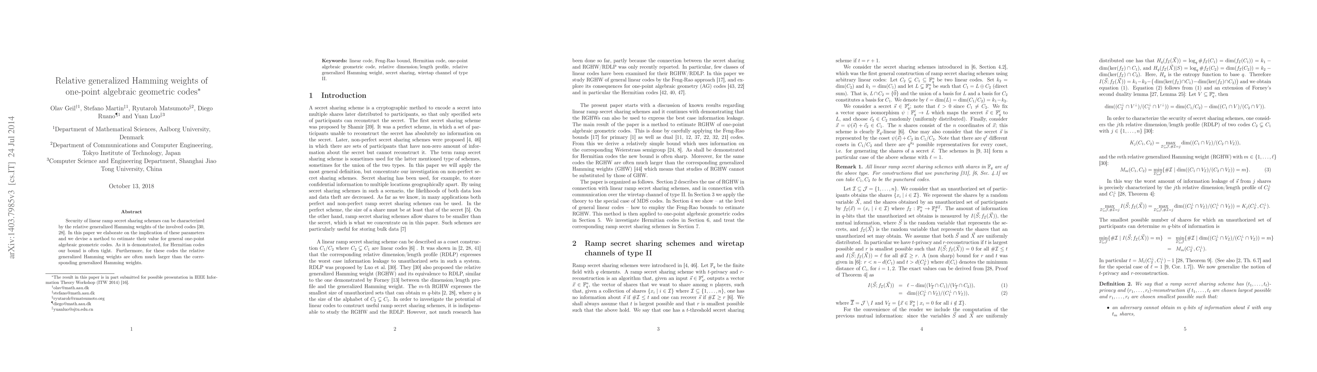 Security of linear ramp secret sharing schemes can be characterized by the relative generalized Hamming weights of the involved codes. In this paper we elaborate on the implication of these parameters and we devise a method to estimate their value for general one-point algebraic geometric codes. As it is demonstrated, for Hermitian codes our bound is often tight. Furthermore, for these codes the relative generalized Hamming weights are often much larger than the corresponding generalized Hamming weights.