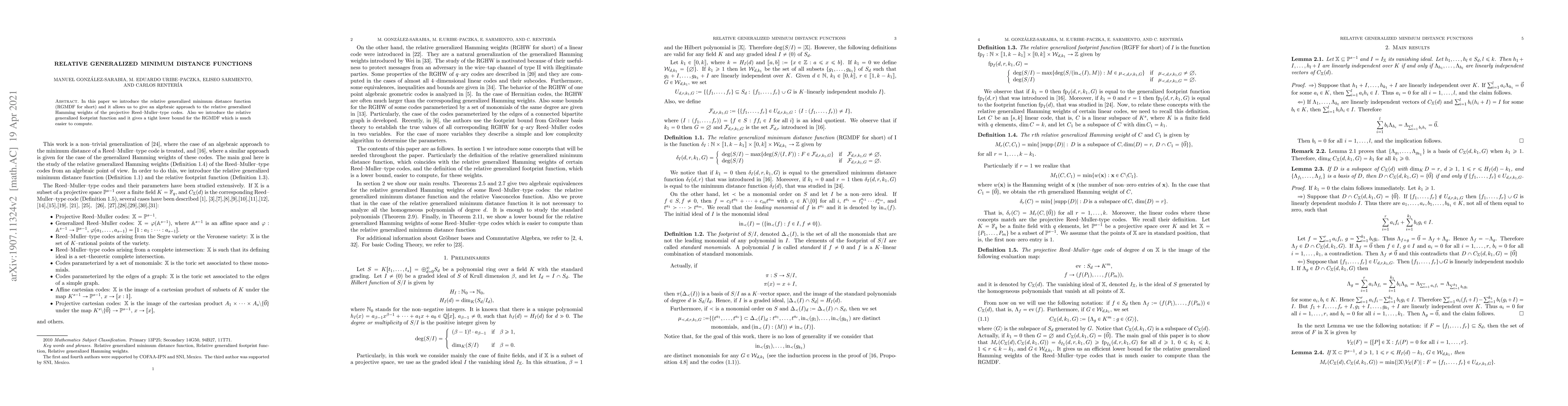 In this paper we introduce the relative generalized minimum distance function (RGMDF for short) and it allows us to give an algebraic approach to the relative generalized Hamming weights of the projective Reed--Muller--type codes. Also we introduce the relative generalized footprint function and it gives a tight lower bound for the RGMDF which is much easier to compute.