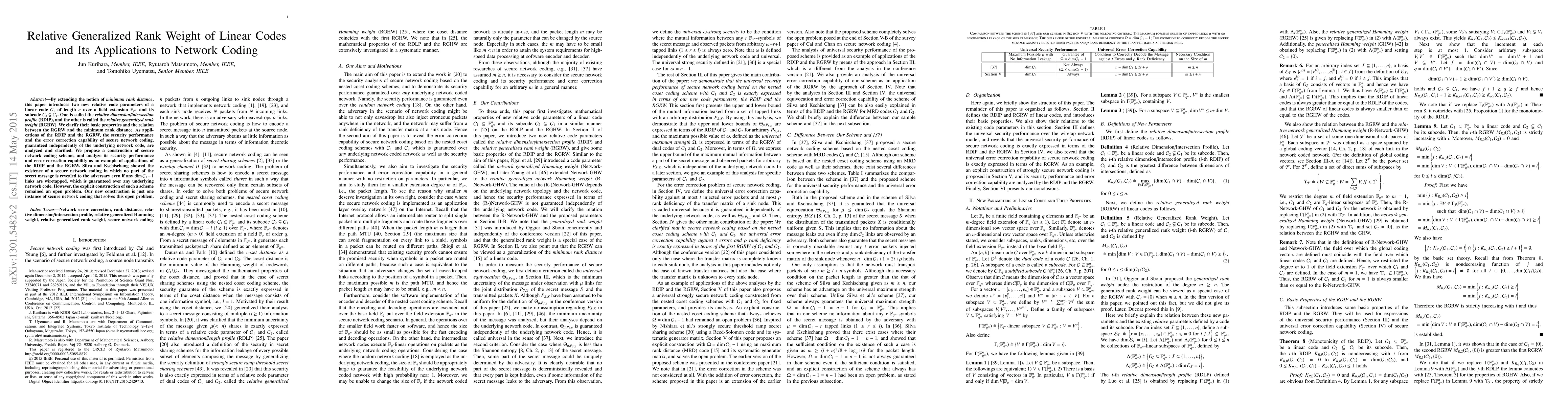 This paper introduces two new metrics for linear codes: relative dimension/intersection profile (RDIP) and relative generalized rank weight (RGRW), which help analyze network coding security performance and error correction capability.
