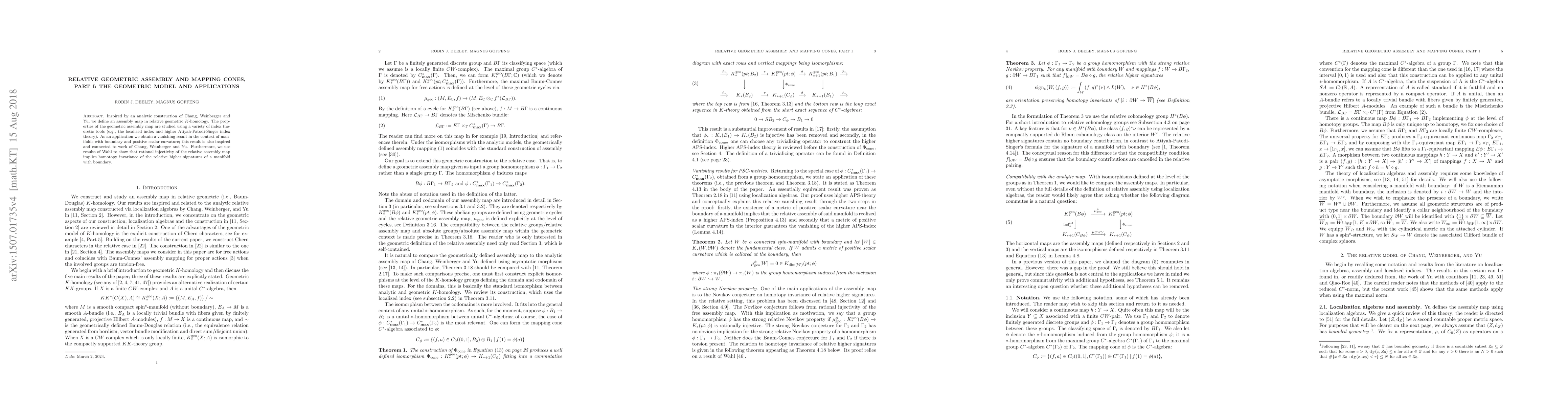 This paper introduces an assembly map in relative geometric $K$-homology, exploring its properties through index theoretic tools. It applies these findings to demonstrate a vanishing result for manifolds with boundary under positive scalar curvature, and shows that rational injectivity of the assembly map leads to homotopy invariance of relative higher signatures.