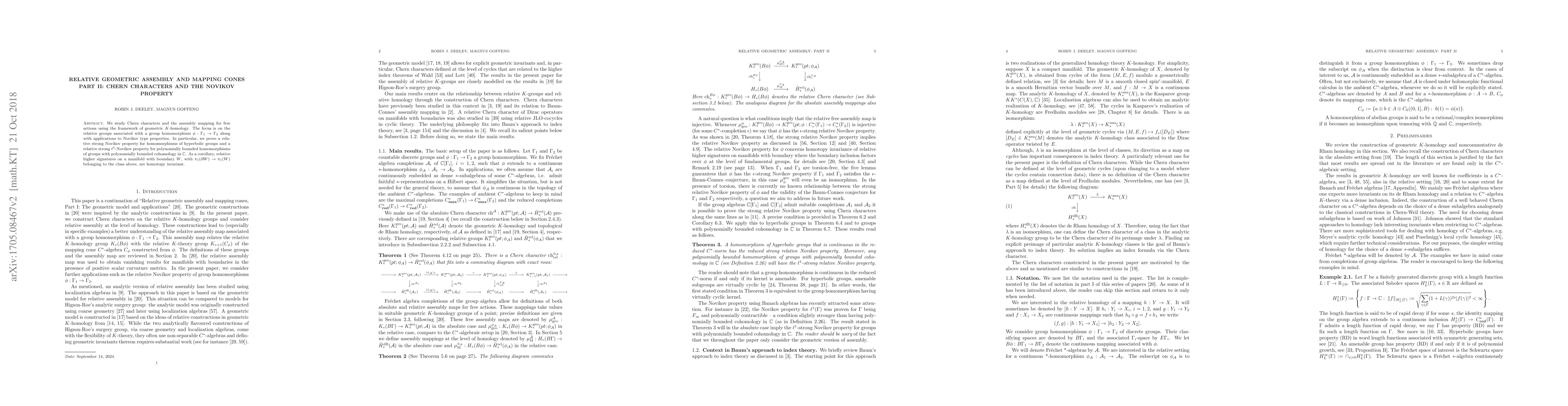 This paper investigates Chern characters and assembly mappings in the context of free group actions using geometric $K$-homology. It establishes a relative strong Novikov property for homomorphisms between hyperbolic groups and a relative $\ell^1$-Novikov property for polynomially bounded homomorphisms, leading to homotopy invariance of relative higher signatures on manifolds with specific boundary conditions.