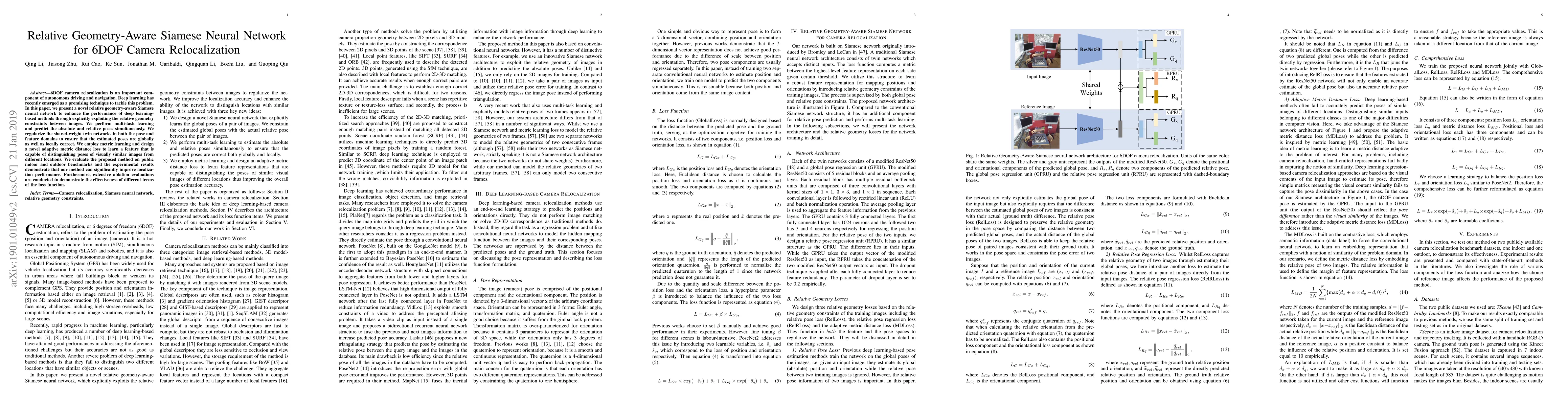 A new neural network method improves 6DOF camera relocalization performance through relative geometry awareness, achieving significant localization gains on public benchmarks.