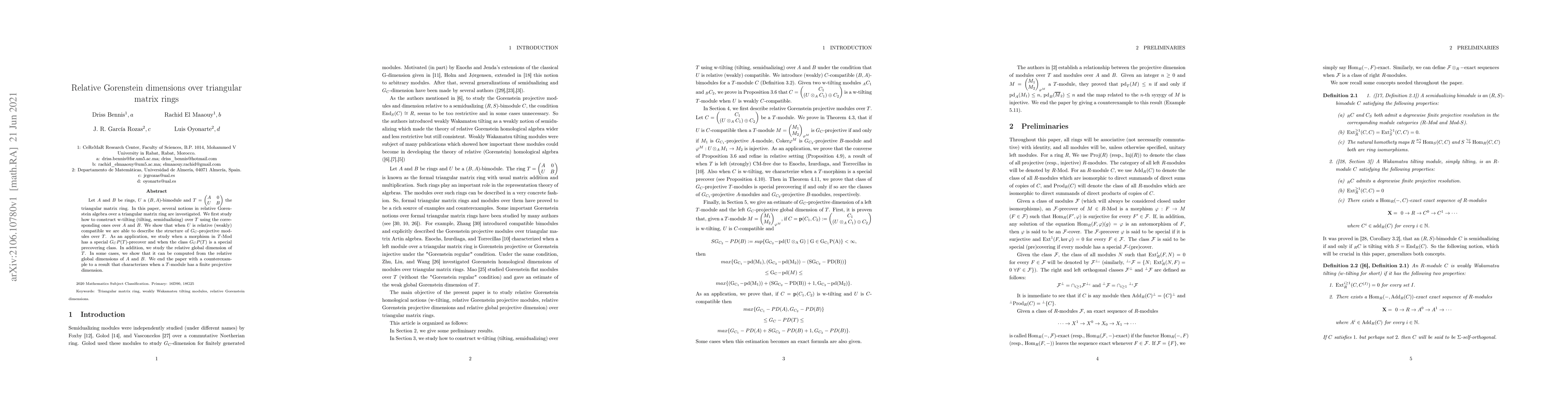 This paper investigates relative Gorenstein dimensions over triangular matrix rings, specifically the ring $T=\begin{pmatrix} A & 0 \\ U & B \end{pmatrix}$. It constructs w-tilting and tilting modules over $T$ using corresponding modules over $A$ and $B$, and explores when $U$ is compatible, determining the structure of $G_C$-projective modules over $T$. The paper also examines the relative global dimension of $T$ and provides a counterexample regarding projective dimension characterization.