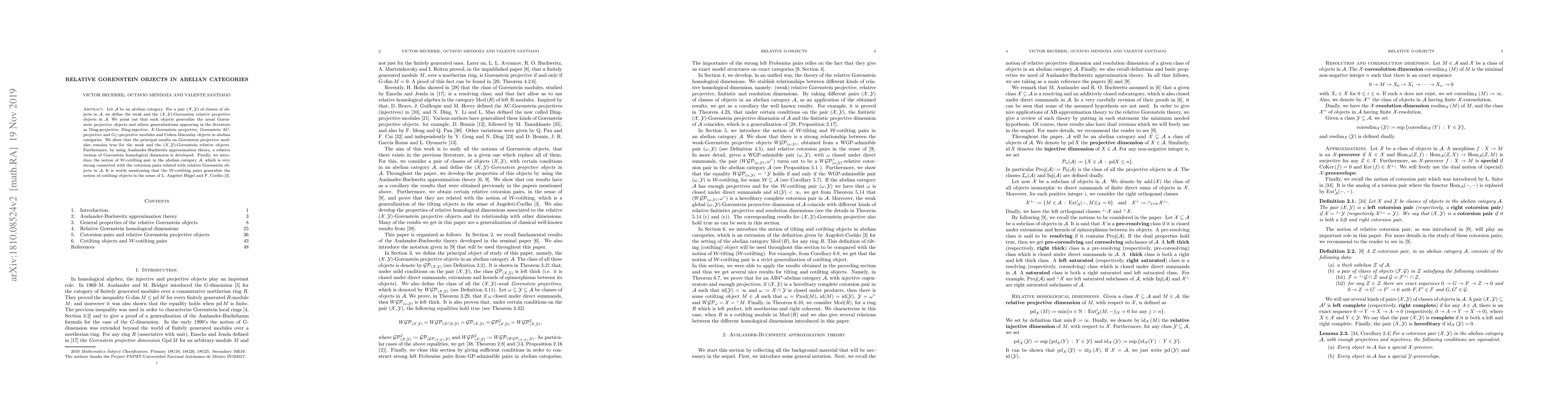 Let $\mathcal{A}$ be an abelian category. For a pair $(\mathcal{X},\mathcal{Y}$ of classes of objects in $\mathcal{A},$ we define the weak and the $(\mathcal{X},\mathcal{Y})$-Gorenstein relative projective objects in $\mathcal{A}$. We point out that such objects generalize the usual Gorenstein projective objects and others generalizations appearing in the literature as Ding-projective, Ding-injective, $\mathcal{X}$-Gorenstein projective, Gorenstein AC-projective and $G_C$-projective modules and Cohen-Macaulay objects in abelian categories. We show that the principal results on Gorenstein projective modules remains true for the weak and the $(\mathcal{X},\mathcal{Y}$-Gorenstein relative objects. Furthermore, by using Auslander-Buchweitz approximation theory, a relative version of Gorenstein homological dimension is developed. Finally, we introduce the notion of $\mathcal{W}$-cotilting pair in the abelian category $\mathcal{A}$, which is very strong connected with the cotorsion pairs related with relative Gorenstein objects in $\mathcal{A}$. It is worth mentioning that the $\mathcal{W}$-cotilting pairs generalize the notion of cotilting objects in the sense of L. Angeleri H\"ugel and F. Coelho.