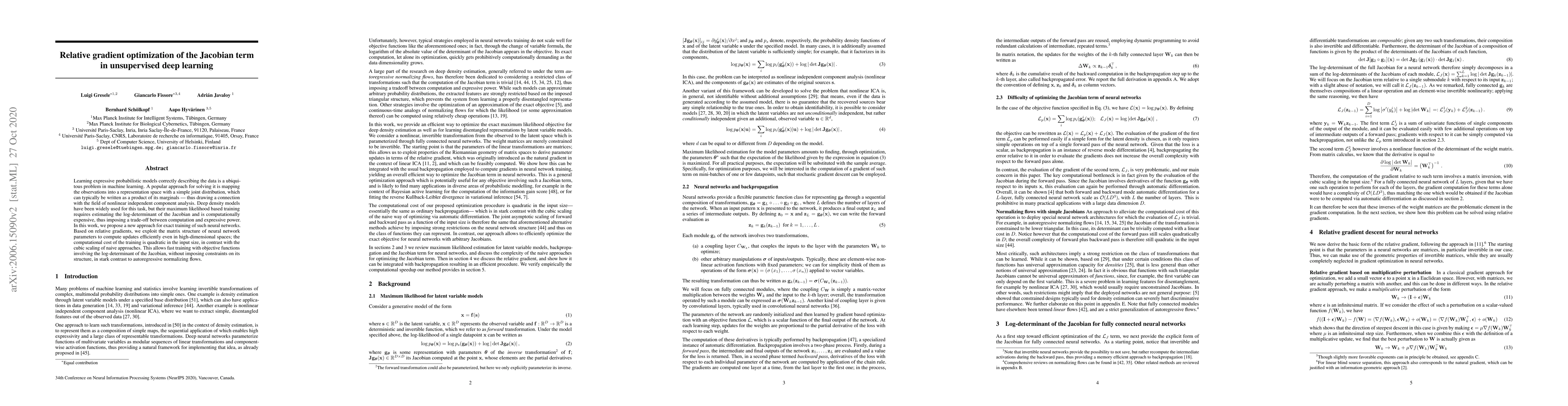 This research introduces a new method for efficiently training deep probabilistic models by using relative gradients to compute Jacobian-related updates, significantly reducing computational costs. The approach enables accurate, high-dimensional modeling without restrictive Jacobian structures, improving the scalability of unsupervised deep learning methods.