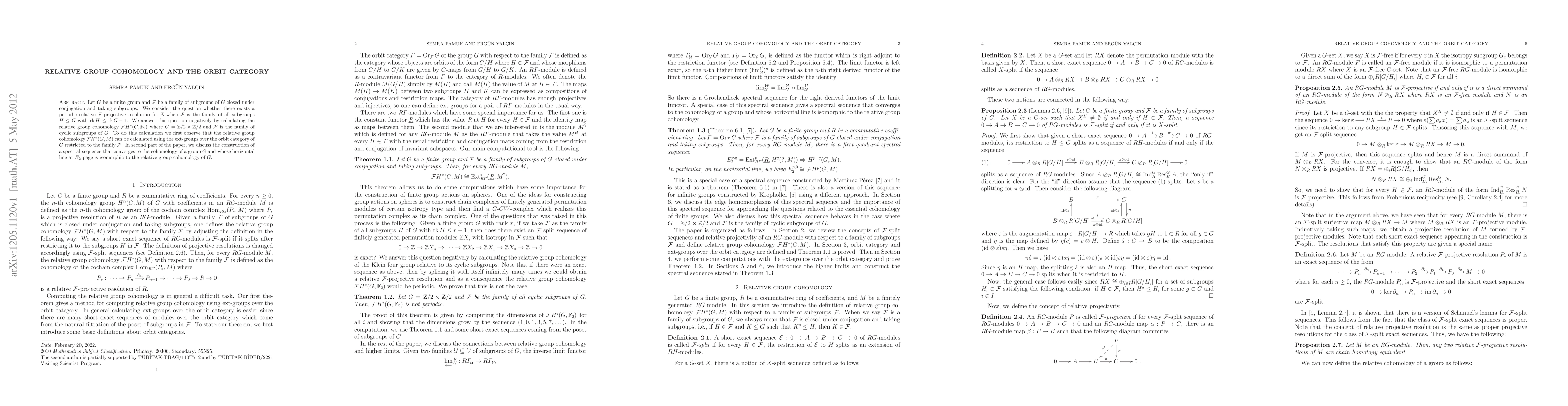Let $G$ be a finite group and $\cF$ be a family of subgroups of $G$ closed under conjugation and taking subgroups. We consider the question whether there exists a periodic relative $\cF$-projective resolution for $\bbZ$ when $\cF$ is the family of all subgroups $H \leq G$ with $\rk H \leq \rk G-1$. We answer this question negatively by calculating the relative group cohomology $\cF H^* (G, \bbF_2)$ where $G=\bbZ/2\times \bbZ /2$ and $\cF$ is the family of cyclic subgroups of $G$. To do this calculation we first observe that the relative group cohomology $\cF H^*(G, M)$ can be calculated using the ext-groups over the orbit category of $G$ restricted to the family $\cF$. In second part of the paper, we discuss the construction of a spectral sequence that converges to the cohomology of a group $G$ and whose horizontal line at $E_2$ page is isomorphic to the relative group cohomology of $G$.