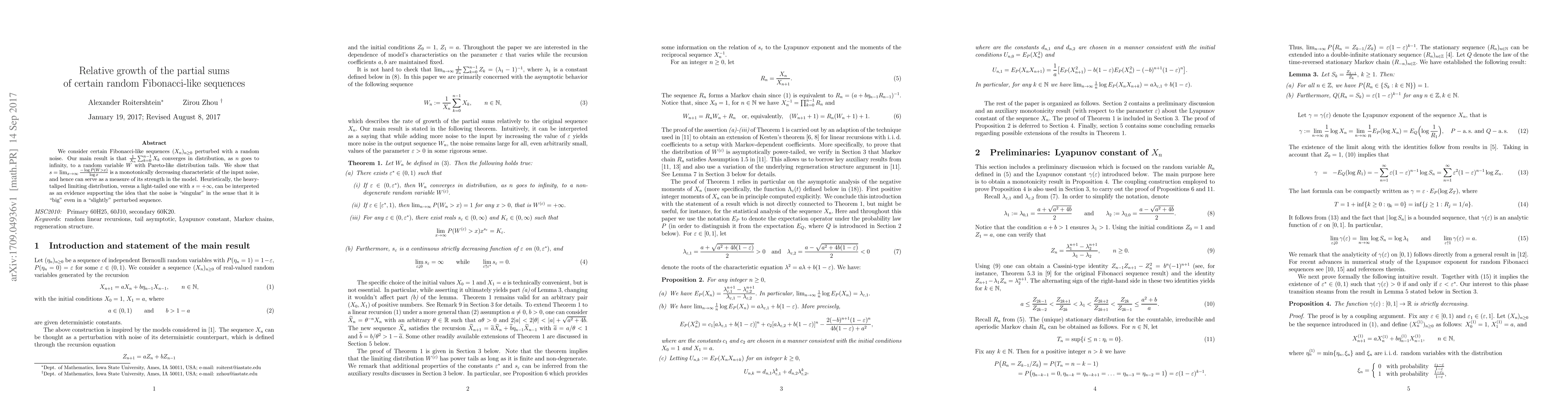 We consider certain Fibonacci-like sequences $(X_n)_{n\geq 0}$ perturbed with a random noise. Our main result is that $\frac{1}{X_n}\sum_{k=0}^{n-1}X_k$ converges in distribution, as $n$ goes to infinity, to a random variable $W$ with Pareto-like distribution tails. We show that $s=\lim_{x\to \infty} \frac{-\log P(W>x)}{\log x}$ is a monotonically decreasing characteristic of the input noise, and hence can serve as a measure of its strength in the model. Heuristically, the heavy-taliped limiting distribution, versus a light-tailed one with $s=+\infty,$ can be interpreted as an evidence supporting the idea that the noise is "singular" in the sense that it is "big" even in a "slightly" perturbed sequence.