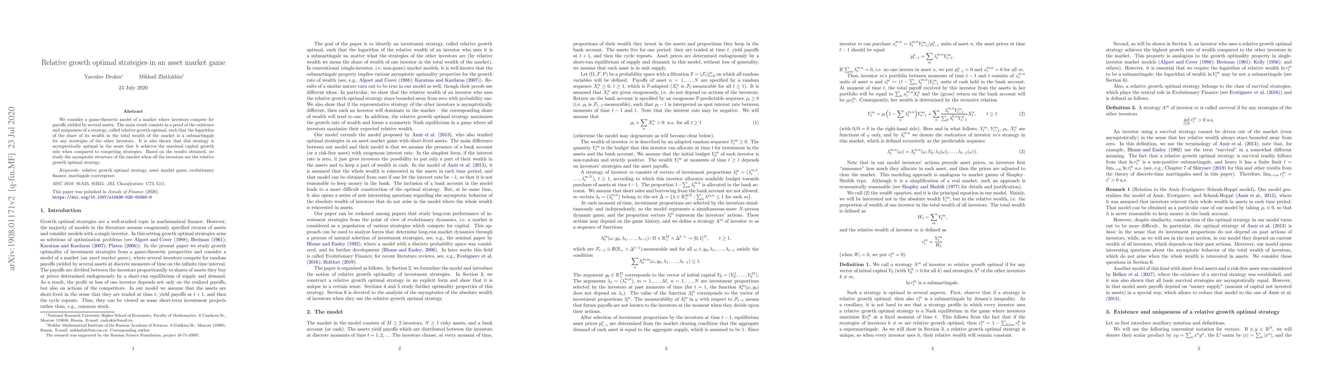 We consider a game-theoretic model of a market where investors compete for payoffs yielded by several assets. The main result consists in a proof of the existence and uniqueness of a strategy, called relative growth optimal, such that the logarithm of the share of its wealth in the total wealth of the market is a submartingale for any strategies of the other investors. It is also shown that this strategy is asymptotically optimal in the sense that it achieves the maximal capital growth rate when compared to competing strategies. Based on the results obtained, we study the asymptotic structure of the market when all the investors use the relative growth optimal strategy.