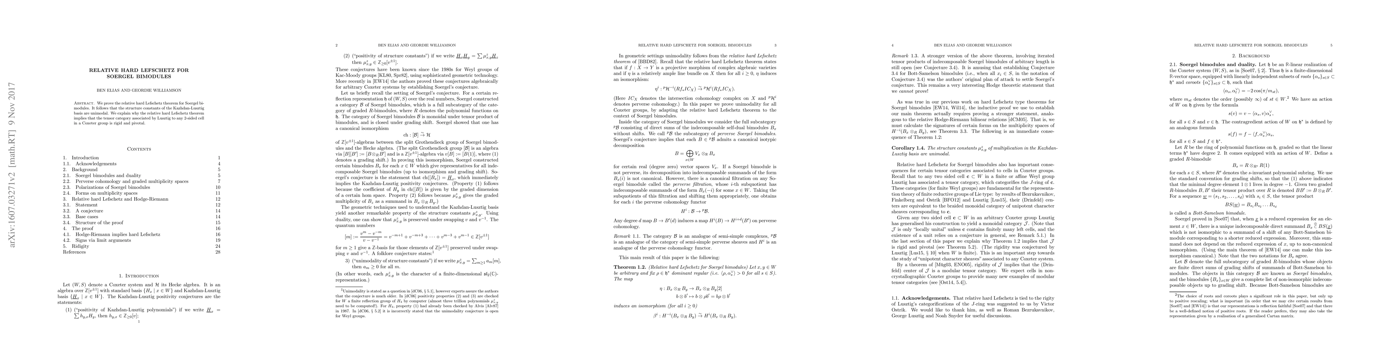 This paper proves the relative hard Lefschetz theorem for Soergel bimodules, demonstrating that the structure constants of the Kazhdan-Lusztig basis are unimodal. It also explains how this theorem implies that the tensor category associated with any 2-sided cell in a Coxeter group is rigid and pivotal.
